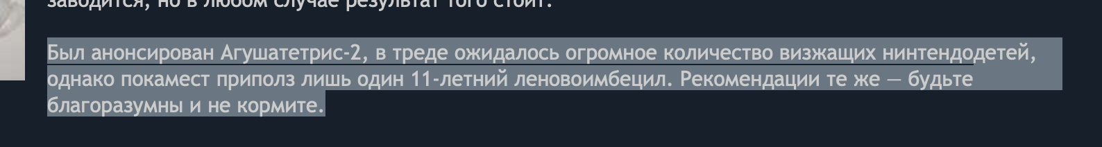 Был анонсирован Агушатетрис-2, в треде ожидалось огромное количество визжащих нинтендодетей, однако покамест приполз лишь один 11-летний леновоимбецил. Рекомендации те же — будьте благоразумны и не кормите.