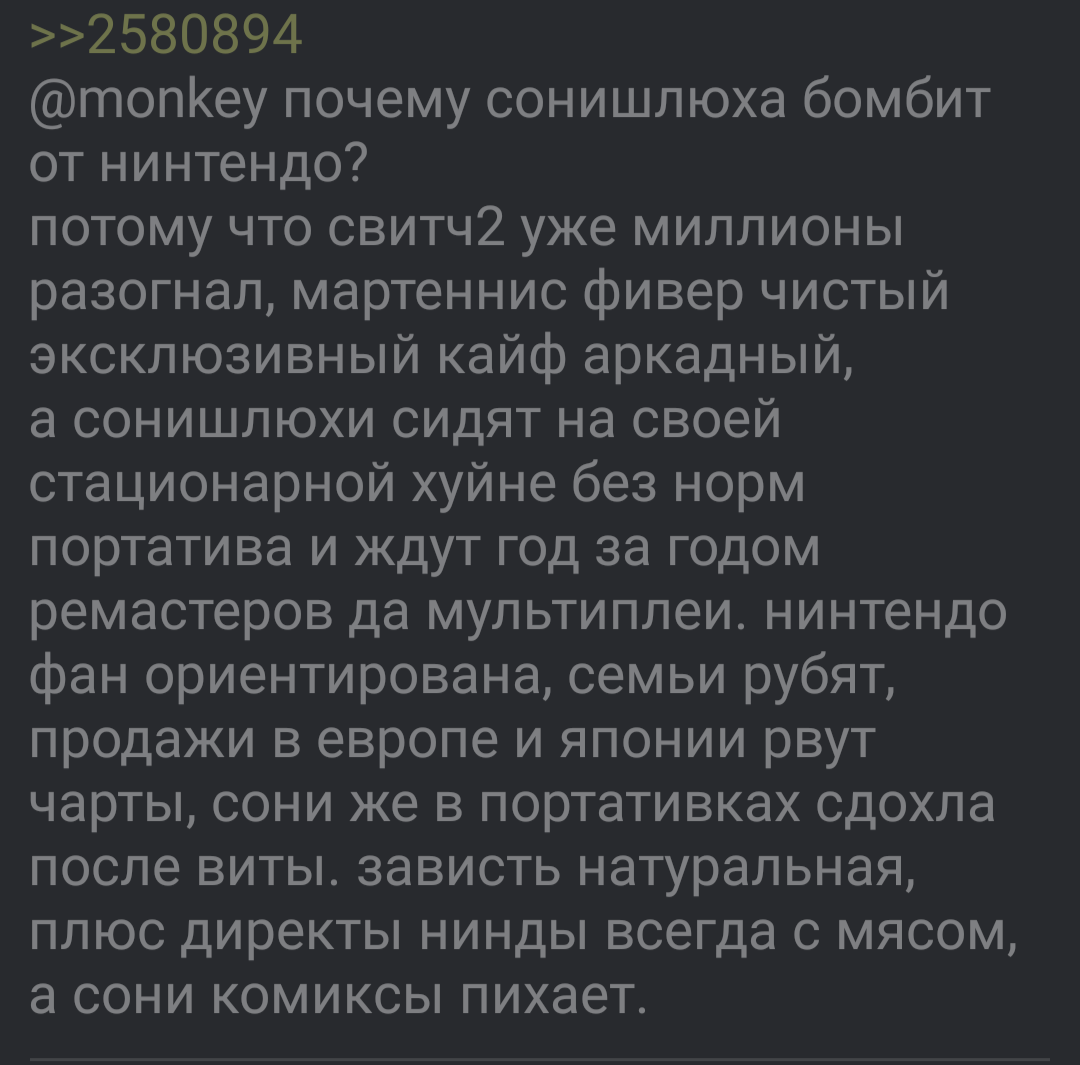 ебало свичушка все то же, ухмыляющееся. пука-порты? ну ок, пускай сони свои эксклюзивы в облаке пихает, а мы зельду и марио в жопном кармане таскаем без лагов и подписок. PSSR охуенна, спору нет, но апскейлер не заменит батарейку на 6 часов игры в дороге. сингловые игры? зумерские ААА с открытым миром по 100+ часов мы тоже умеем, плюс мультиплеер в сплате и армсе не хуже их лайв-сервисов. воюем портативностью и отсутствием микротранзакций в мясных хитах, анон.