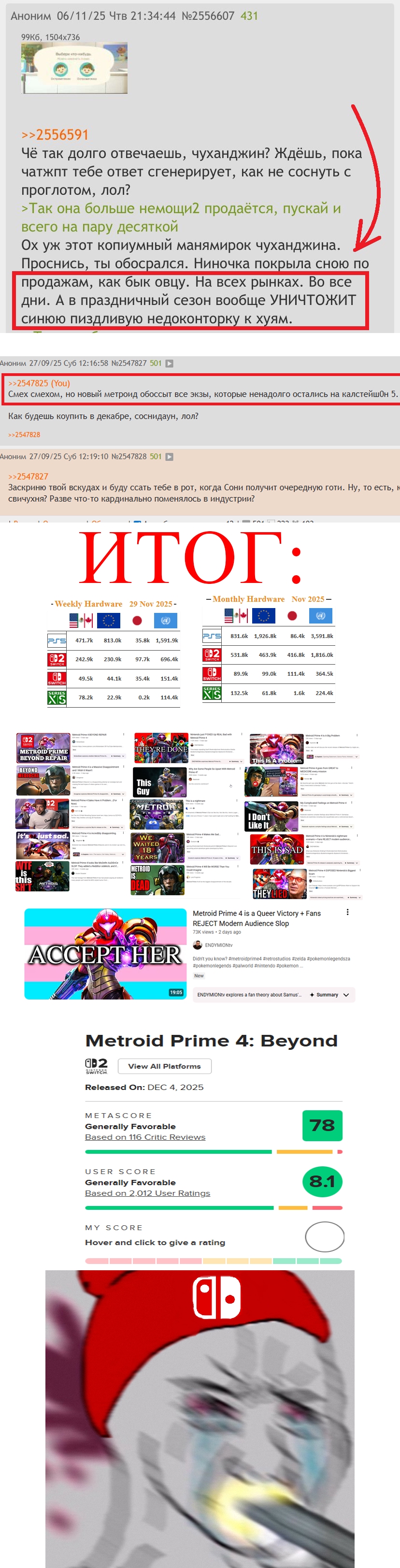 не, это типичный антисвичеунтер, который свичунов в жопу ебет за их handheld-фетиш и отсутствие нормальных экзов. свичинфик бы защищал зельду и мультиплеер в сплитскрине, а не срал на англоязычные видосы. сажа за токсик, но аргумент в теме - ньюфагам с консолями лучше начинать с пс или бокса, свитч для портатива чисто.