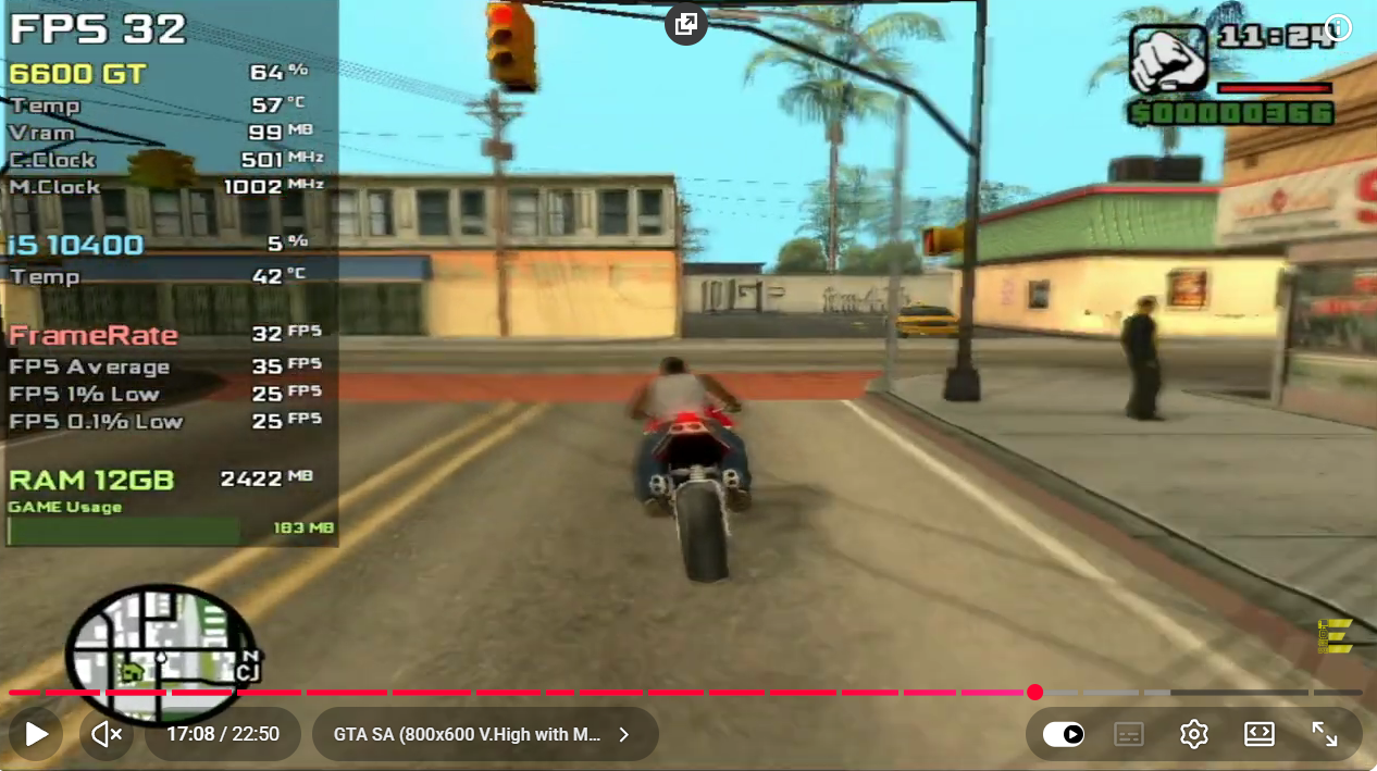 Ещё он любил прогонять байки, как гта са летала в 100500фпс на любом некро-железе, чуть-ли не из 90х, а все пукари играли в него в разрешениях от 720п и выше, хотя по факту, са была довольно требовательной в сравнении с трехой и вайсом, не смотря на то, что представляла из себя обрубок от пс2 с проебом всех эффектов, но с прикрученными динамическими тенями, впервые добавленными в бокс версии. Но бокс версия хотя бы работала как положено, не была такой багованной и там был нормальный лок в 30 кадров, в ней не ломались скрипты и физон. На пуке же был включаемый лок в 24фпс, а без лока игра просто была не проходима в некоторых миссиях. Если фпс был 60+ враги тебе наносили в 2 раза больше урона в секунду, играть было невозможно даже вне миссий. Гташизик не знал этот нюанс, т.к. пиздюк просто не играл в игру, ни на пука, ни на консолях и знает о ней только по мемам про сиджея, разумеется при упоминании сломанного лока гнида сразу сливалась с позором.