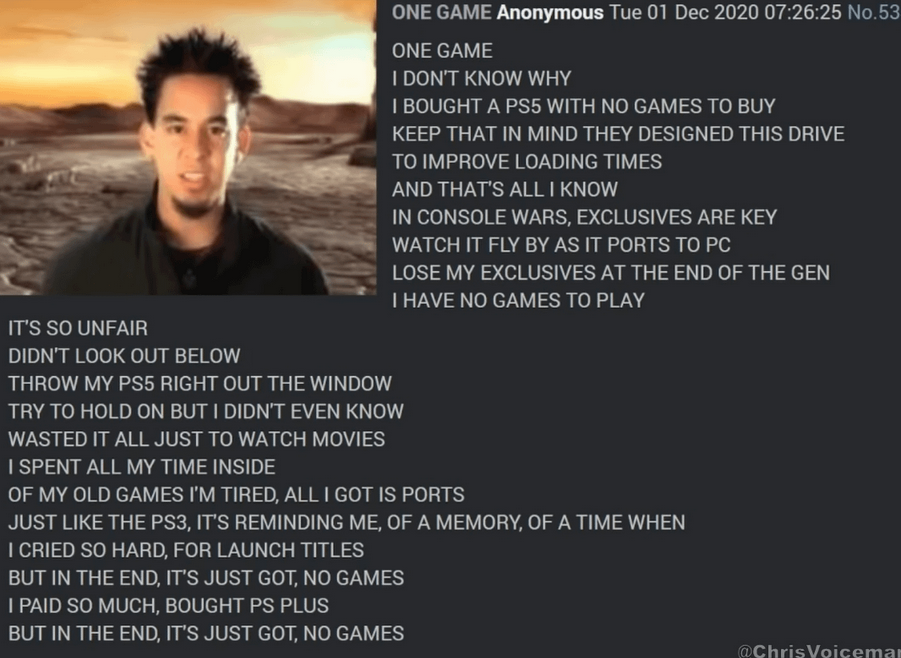 Предъявите к осмотру мне ебало местного свичушка после того, как сони за три последних дня: 1) перекрыла пука-порты, 2) выпустила новую версию PSSR, которая охуенна, 3) возвращается к упору на сингловые игры. Чем он теперь будет воевать с ненавистной ему компанией?