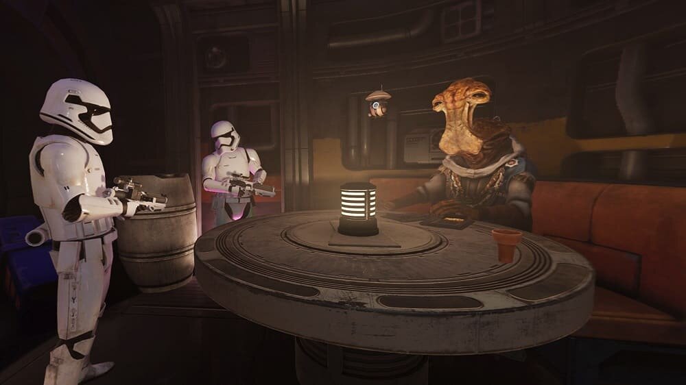 Star Wars: Tales from the galaxy’s edge - это ремастер с первой PlayStation VR. И это чувствуется. Геймплей сразу кажется каким-то допотопным, неуклюжим и ограниченным, особенно в сравнении с Horizon и The Walking Dead, о которых я писал выше. Но что хуже всего, у разработчиков не получилось реализовать свой творческий замысел - показать, что франшиза может бодро ощущать себя и без россыпи классических штампов. Если и может, то конкретно у этой команды показать этого не получилось: игра хоть как-то оживает только во время штурма базы Первого Ордена, до этого все «ЗВ» держалось на наличии C3PO и R2D2, убери их, и вселенную будет просто не узнать.