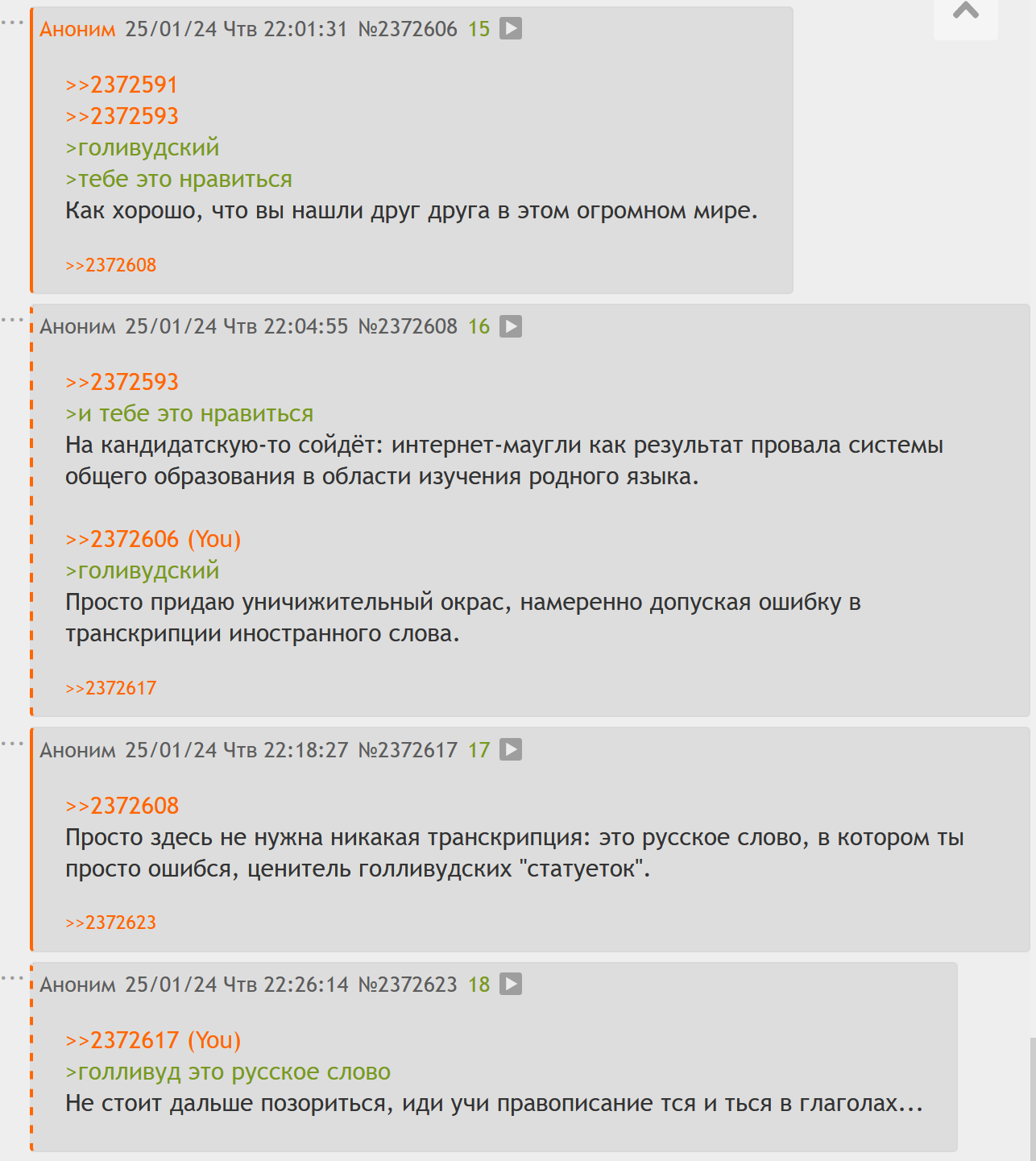 >>2372638 >думает что голливуд это русское слово >называет кого-то жертвой ЕГЭ Понятно, видимо ты просто жертва 90-ых. Алкоголь, токсикомания, нищета сказались на развитии мозга... Hollywood это английское имя собственное, которое я могу писать как угодно, холливуд, галевуд, голивуд, могу делать какие угодно ошибки в транскрипции этого слова, ведь это не часть русского языка. Традиционная транслитерация на русский - голливуд, но никто не обязывает меня следовать этим правилам, т.к. русская транслитерация это не часть русского языка (также как например процесс перевода на русский это не часть русского языка)