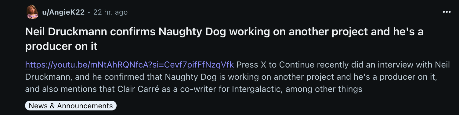 >Neil Druckmann on the TLOU2 Doc: "The next project at Naughty Dog is not an The Last of Us, but TLOU3 is at a concept level since there is one more chapter to the story"