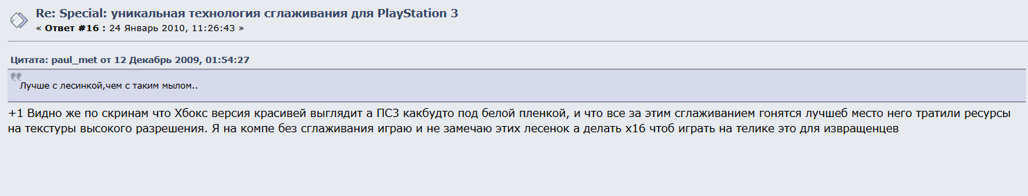 >>2571595 >Почему именно с выходом пс3 пошли тупые набросы от пукарей про "мыло" и прочую хуйню? Потому что в эпоху пс2 никто в трезвом уме не думал противопоставлять божественный пк vs приставку под тв. По умолчанию было понятно, что пк лучше, но сложнее. Да и вместо нормального устройства для вывода изображения у кaлcoлeй тогда использовали элт телевизоры на которых и так нихуяшечки не было видно. С внедрением в мылостанцию3 hdmi и переходом с элт тв повылазило школиё и тогдашние скуфы которые повелись на якобы графон как на пк, но только дешевле и для безграмотных. Ну и конечно сони начала активную рекламу на рынке СНГ пудря людям мозги, что и стало моментом появления первых самых отбитых жертв маркетинга aka сонибоев типа борьки. А мыло. Ну так на пс3 реально мыло повсеместно и ужасный фреймрейт. И всякие вырученные на максимум моушен блюры чтобы скрыть рваную картинку.