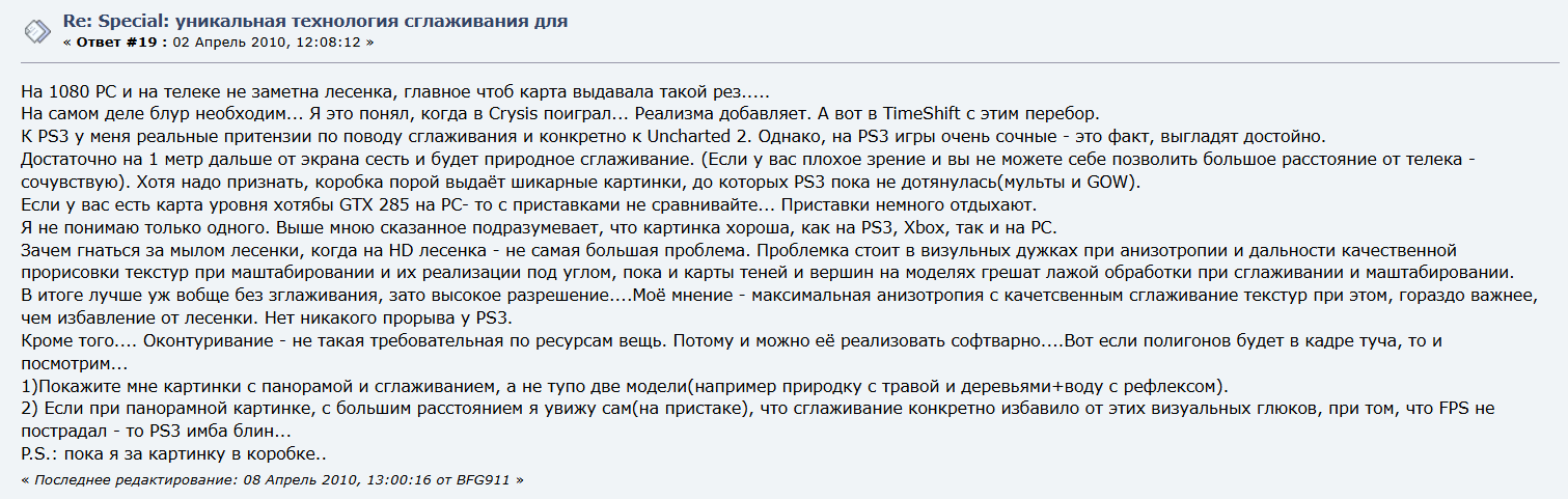 >>2571595 Ну в целом все так, да. Но тут есть нюанс - на пс3 действительно картинка чаще была мыльнее из-за сглаживания. На плойке это обычно мылящий FXAA, а на боксе не редко юзали 4х MSAA. Модуль edram, как говорили, позволял юзать такое сглаживание "бесплатно", в то время как на пс3 все ложилось на гпу, который и так был слабее боксового. Но понятно это не везде так было, а edram разрабы вообще как только не юзали, в том числе как буфер для разных дорогих эффектов вместо сглаживания и т.п. Но вот если особенно раннюю мультимочи сравнивать, то там года до 2009 картина одна - на плойке fxaa и картинка мыльнее, но боксе четче из-за msaa. Но пука-обезьяны о таких технических деталях даже и не догадывались и просто срали про мыло, ну если речь про школоту с веге и разных плейграундов. Сами пукари часто вообще без сглаживания играли на своих мидл-затычках на квадратных мониторах 1024х768 в те годы - у ранней мультимочи с бокса поначалу даже вайдсрикна не было, лол. Только квадратные разрешения. А переход на 1080, как тут пишет пука-даун, это уже во-времена, когда пукари потихоньку начали сливать свои квадраты и переходить на современные мониторы - гда 11-12, т.е. ближе к пс4. Тогда и карточки уже были, которые выдавали 30ку в 1080п, пятая серия нвидии та же.