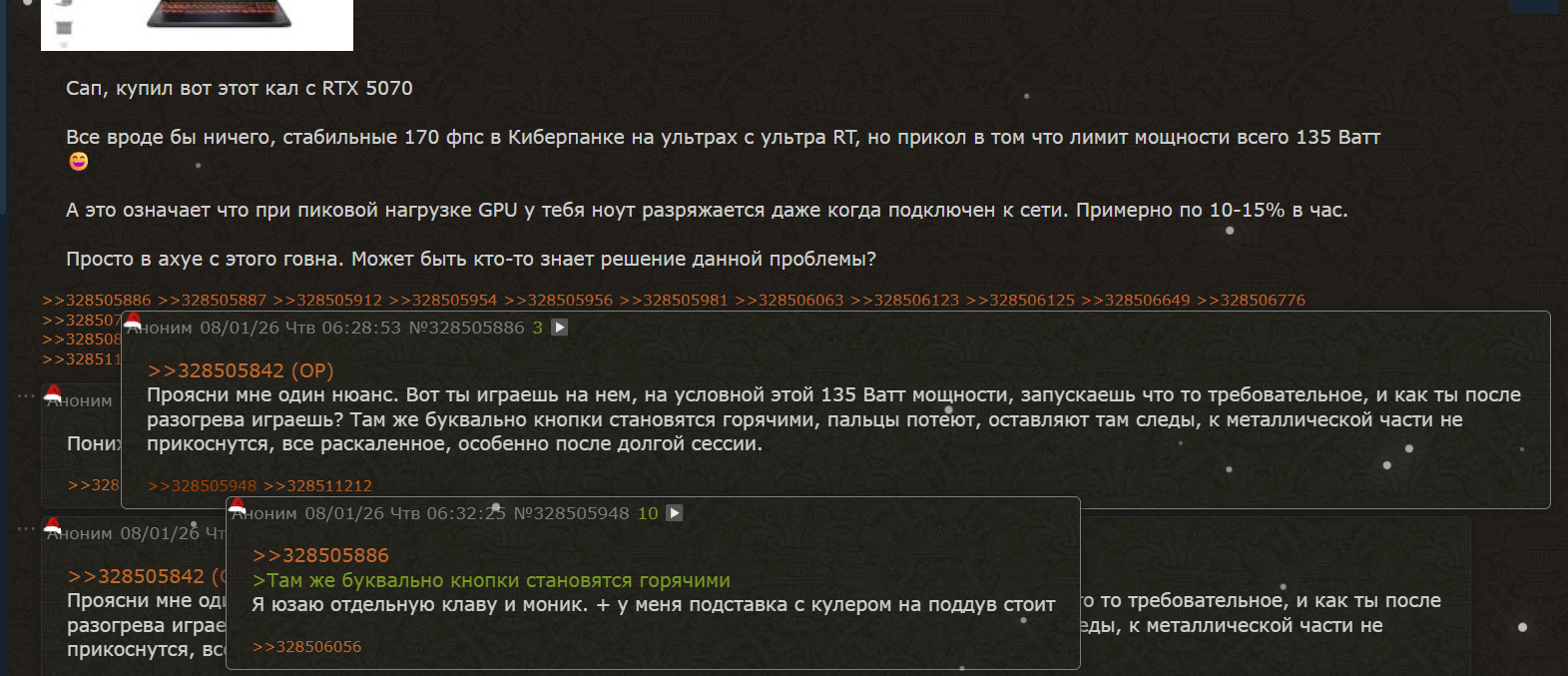 Оригинальный тред с вбросом с 5070 утонул кстати, хотел почитать что там пишут. Хотя в том же хв пишут что ноуты это всегда компромисс и сорта говна и выбирать надо меньшее из говен. Так что к чему шизик выше это притащил хуй знает, может бегает перемоги ищет по всей сосаке, вместо того чтобы играть на своей сосноли (которой у него нет).