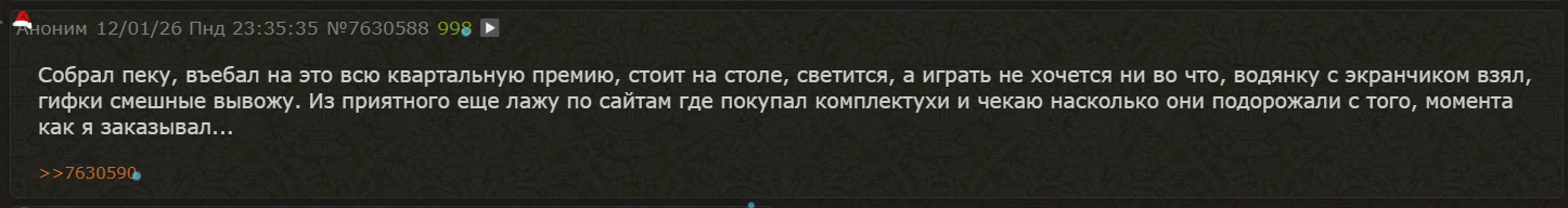 >>2572571 Консольщики имеют работу и ирл, потому не особо заёбываются по поводу 30 фпс, тк не дрочат на циферки и ползунки. Просто пару раз в неделю кежуали играют и не ебут себе мозги. А пукари сидят на устаревших сборках и коупят тем что "ну ээээ я могу поставить железо лучше, но мням цены кхм высокие, потерплю пока в тех же 30 фпс только рваных и с просадками, мням"
