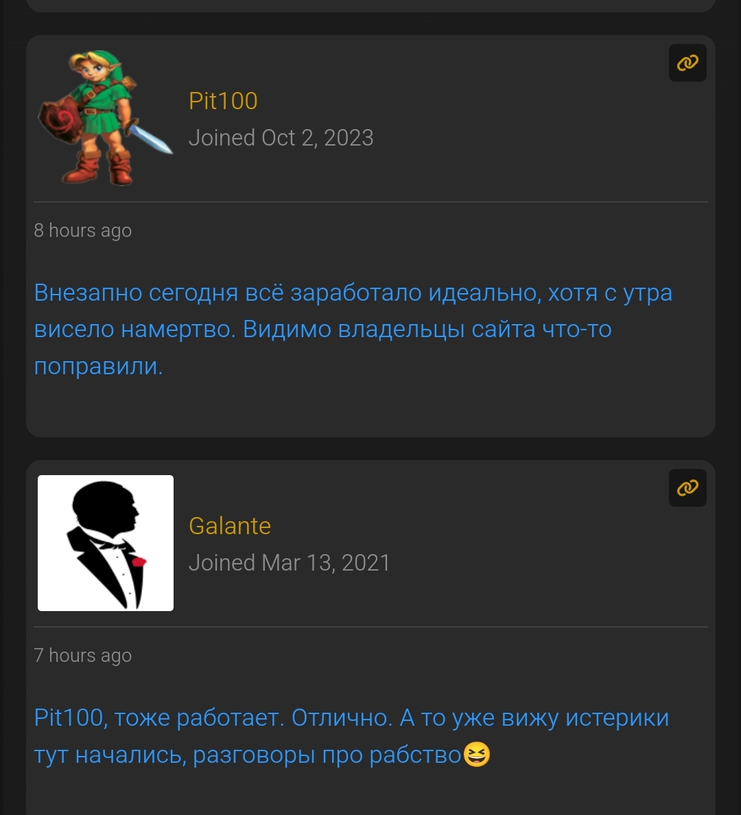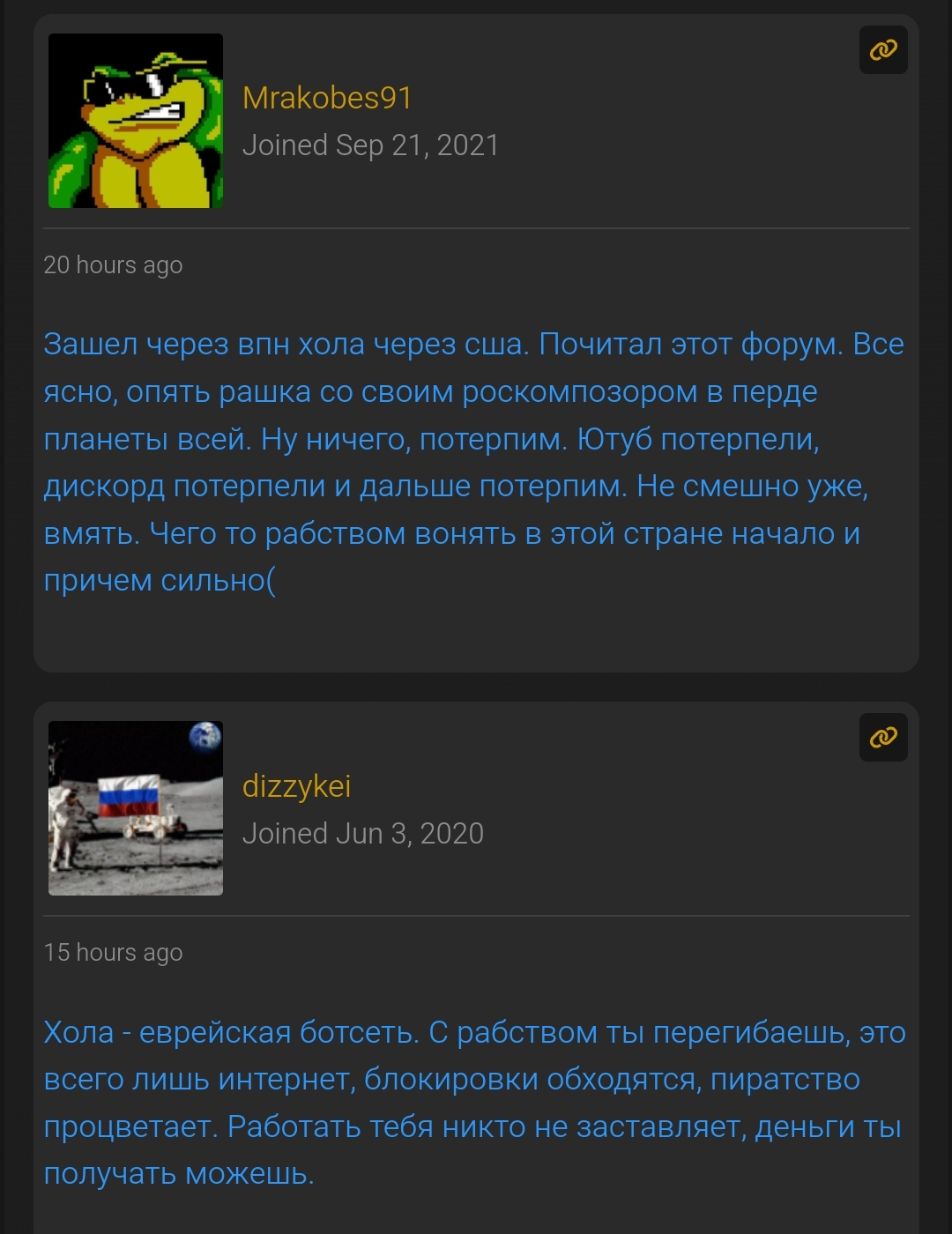 Тут есть те, кто выбивает ретроачивки? Короче, раньше выбивал на компе, но потом купил Анберник, чтобы лампово гамать с ачивочками, лёжа в кроватке. И все было заебись, пока известные дауны не блокнули клаудфлaре, который использует сайт. И это, очевидно, поставило под угрозу все мои результаты на сайте, ибо вчера только под ВэПэN зайти мог. Ладно на компе, там можно какой-нибудь батник с гитхаба накатить, хотя и он в процессе выбивания какой-нибудь сложной ачивки может отвалиться, но портативка превратилась бы в тыкву, ибо без ачивок мне играть в ретро уже не интересно. Слава б-гу на ресурсе много людей из россии, и админы подкрутили, чтоб все без пердолинга работало, но я охуел с персонажей с пикч. При чем это не боты, у людей вполне приличная карьера на сайте есть