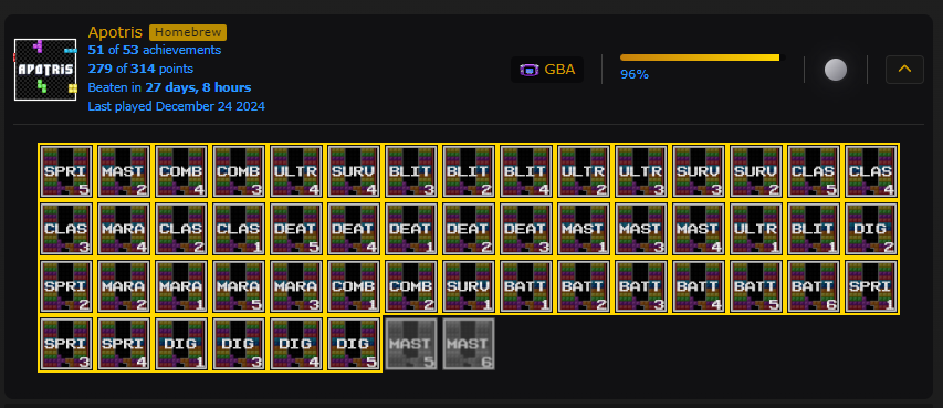 >>2463659 Я выбиваю, иногда, но я не из РФ. Всё работает в штатном режиме. Люблю всякие тетрисы, Апотрис просто топ из топов, но видимо 2 последние ачивки слишком люто для меня.