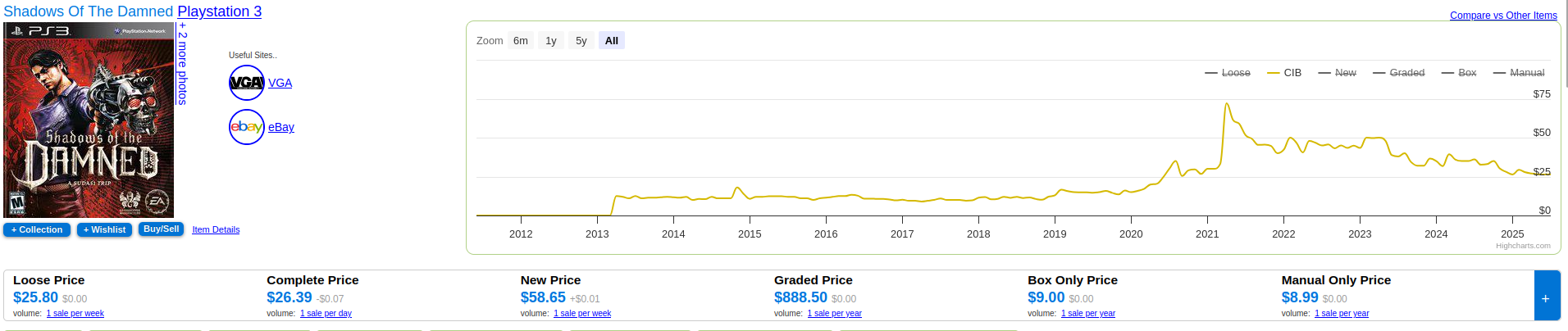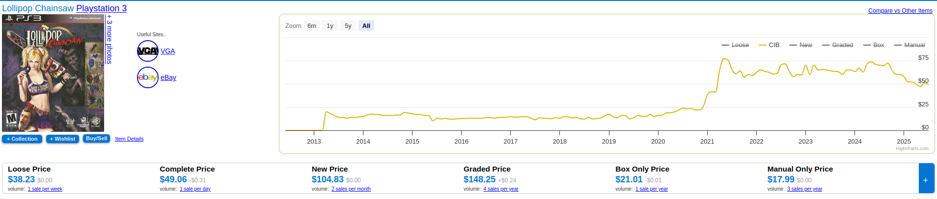 >>2525212 >Lolipop Chainsaw PS3 от 4к вообще коробочками обмазываться не платиной и не легко доступными популярными играми это такой зашквар после ковида, причем это как-бы даже не такая редкая игра учитывая ремастер недавний и что это одна из самых успешных по продажам игр этого разработчика самая дешевая версия это конечно бокс для сравнения еще один их тайтл, тоже 7/10 игра по оценкам у которой продажи поскромнее и как-то цирк с наценкой её обошел стороной