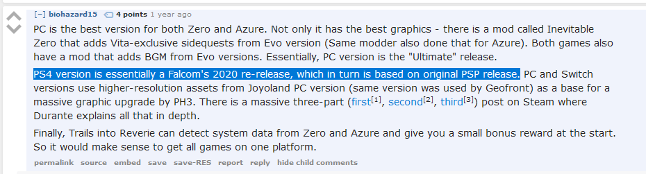 >>2480186 >Я сам проходил версии Виты. Я сперва начал на пк. Потом ради прикола глянул на вите, чёрт, диалоги озвучены, портреты анимированы и музыка не так хрипит. Погуглил и узнал, что переработанна, даже ретектсуринг. Пк версию на удаление и играть в скай на вите. Они там еще и менюшки с боевой системой под кросбел дилогию сделали, очень удобно. Короче вита версия из зе бест, ну пока ремейк не вышел по крайней мере.