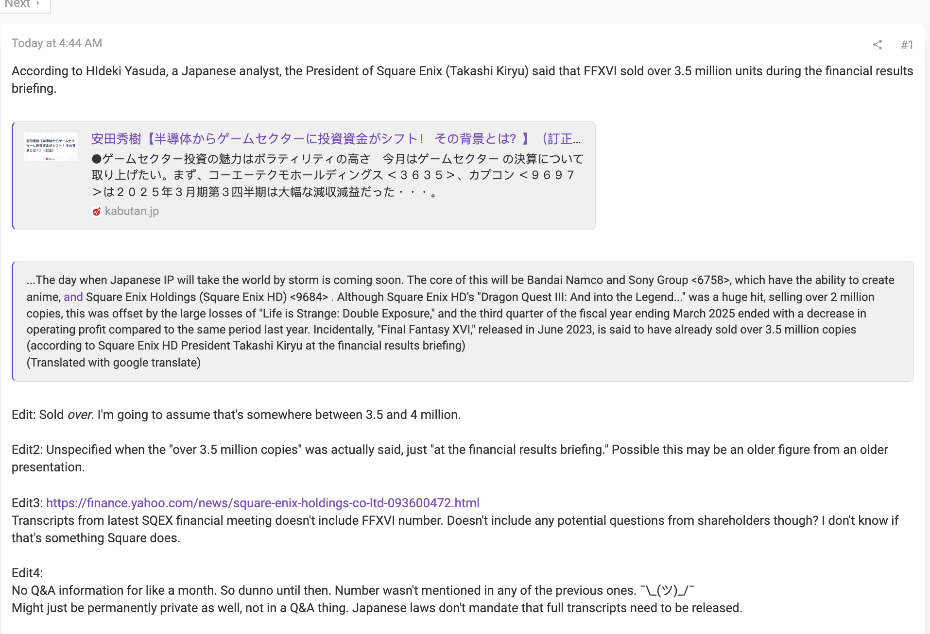 >Хидэки Ясуда: «Продажи FF16 превысили 3,5 миллиона копий, согласно словам Такаши Кирью, президента SE, сказанным им на брифинге для инвесторов» Пиздец. Просто пиздец, лол.