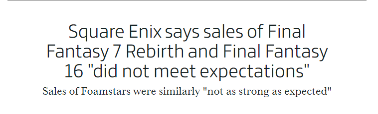 Если уж SE отчиталась даже о продажах FF16 с ее ничтожными продажами, боюсь даже представить, насколько жалкие цифры у реберса. Там походу реально продажи на уровне кисек каких-нибудь.