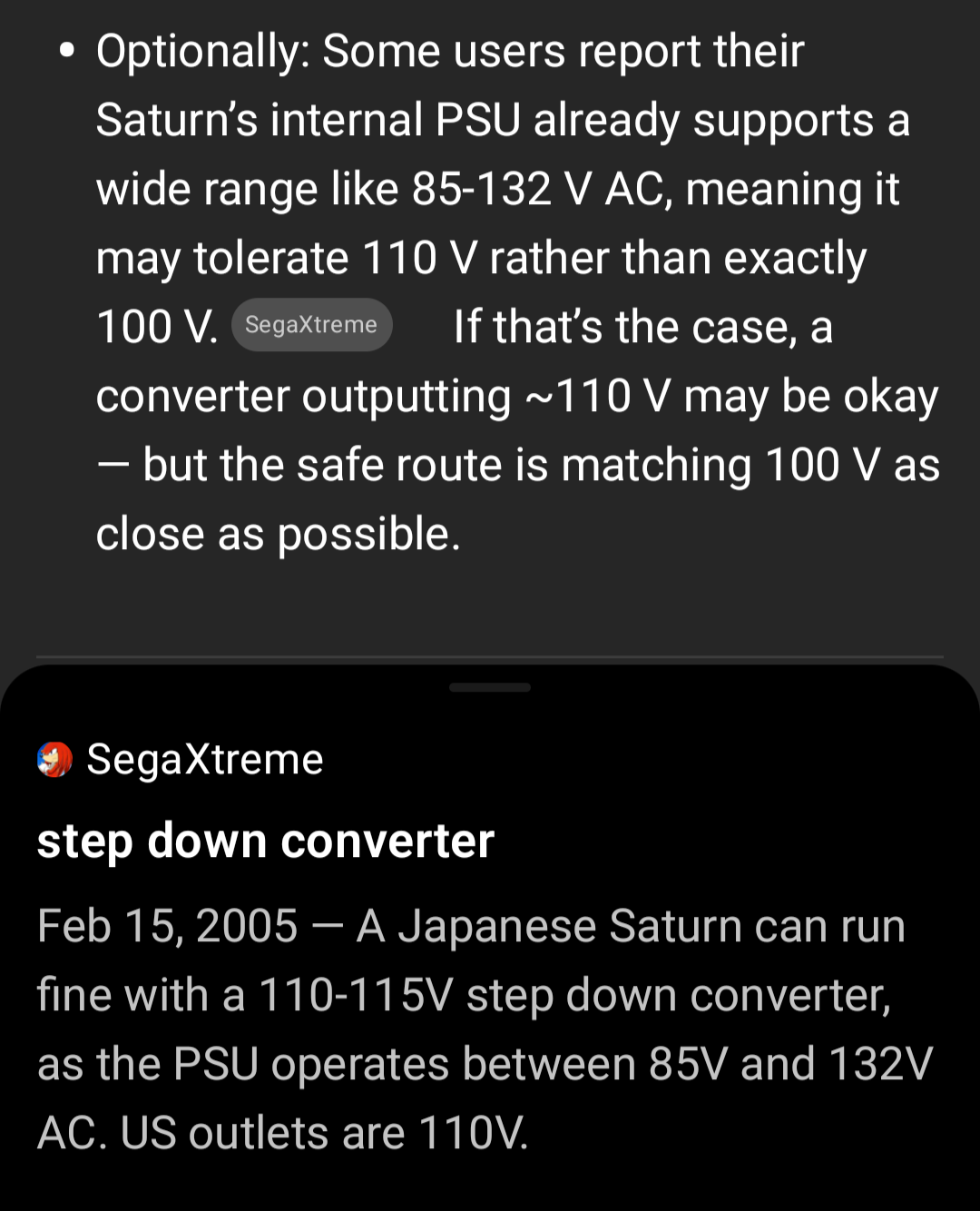 Посоны, я уже подзаебался искать эту инфу. Короче, купил японский Сатурн и хочу его использовать в Гермахе. В Гермахе, в розетках 220в. На Сатурне указано, что ему надо 100в. Смотрю конвертеры на Амазоне, но буквально на всех указывается, что они с 220в на 110в. Такой подойдёт? Не тральте, плз, я не хочу спалить этот милый, бело-розовый Сатурн. А ещё я поиграть в него наконец хочу.