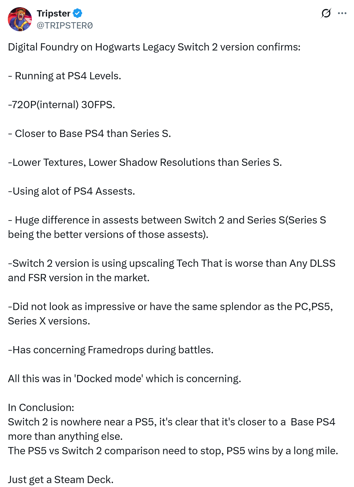 Я наконец-то дождался, пока cycu1 сравннит футажи сыча с футажами для пс5, чтобы посмотреть на какие компромиссы я иду, выбирая версию для сыча. И похоже, что в целом ни на какие не иду. За исключением пары еле заметных отражений, которые на PS5 выглядят чётче, я даже не смогу отличить одну версию от другой. Итого мы имеем: PS5 > Switch2 > Xbox Series S > PS4 Pro > PS4 > Steam Deck