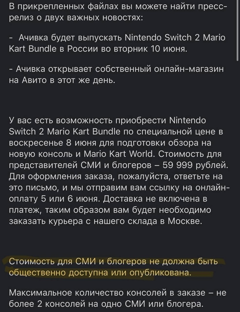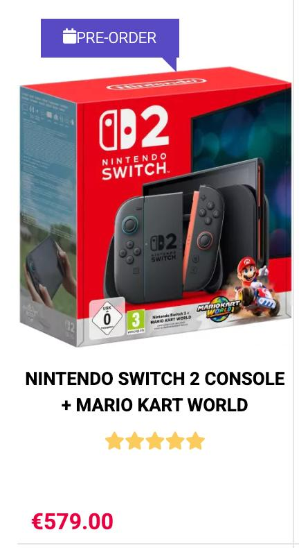 2. В Европе Switch 2 тоже не дешёвый. Не путайте РРЦ (рекомендуемую розничную цену) с той, по которой консоль реально продают. Да, охреневшие продавцы, внезапно, бывают не только в России. В Литве например предзаказ за бандл с Mario Kart World - 579 евро (на скрине), а один мой знакомый живущий в Израиле сделал предзаказ за 2600 шекелей, что равно 649 евро. Да и та история про картриджи за 90 евро - это ведь именно инициатива продавцов, сама Nintendo рекомендует цену максимум в 80 евро.