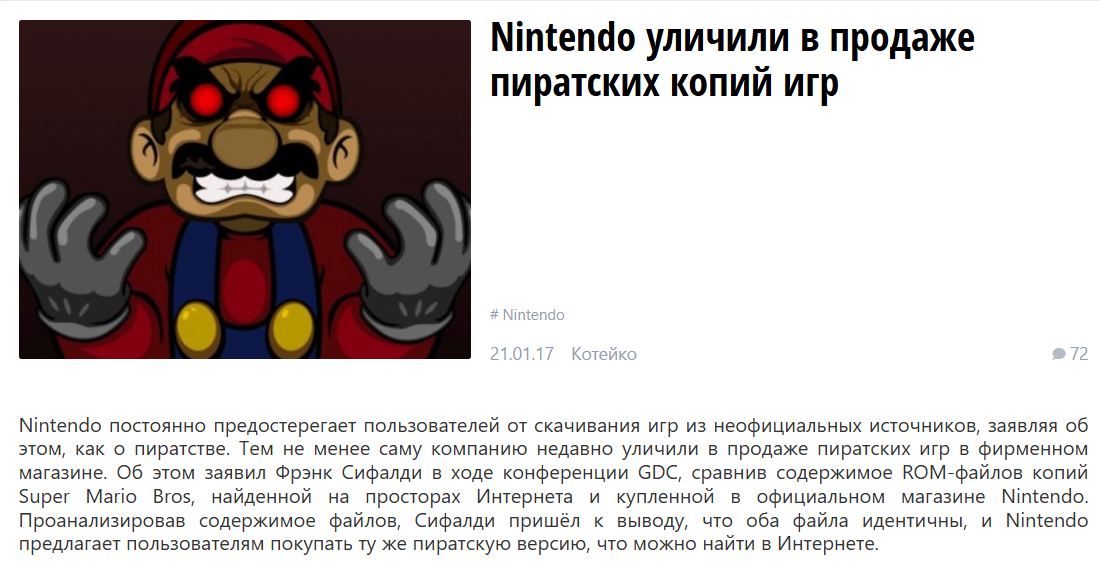 Перед релизом оригинальной Switch в сети появилось видео с меню, и тогда внутри компании поднялась тревога, все пытались выяснить, как это произошло. Nintendo способна довольно точно определить источник утечки: кто за ней стоит, в каком магазине взяли консоль. Меня тогда удивило, сколько всего можно идентифицировать или просканировать, и большинство людей даже не знают об этом. Nintendo узнает, кто стоит за этим. Кит Эллис, бывший пиар-менеджер Nintendo of America Меня забавляют, как бывший работники корпораций всегда пытаются выдать своё очень нужное мнение о бывшем своем рабовладельце.