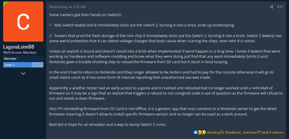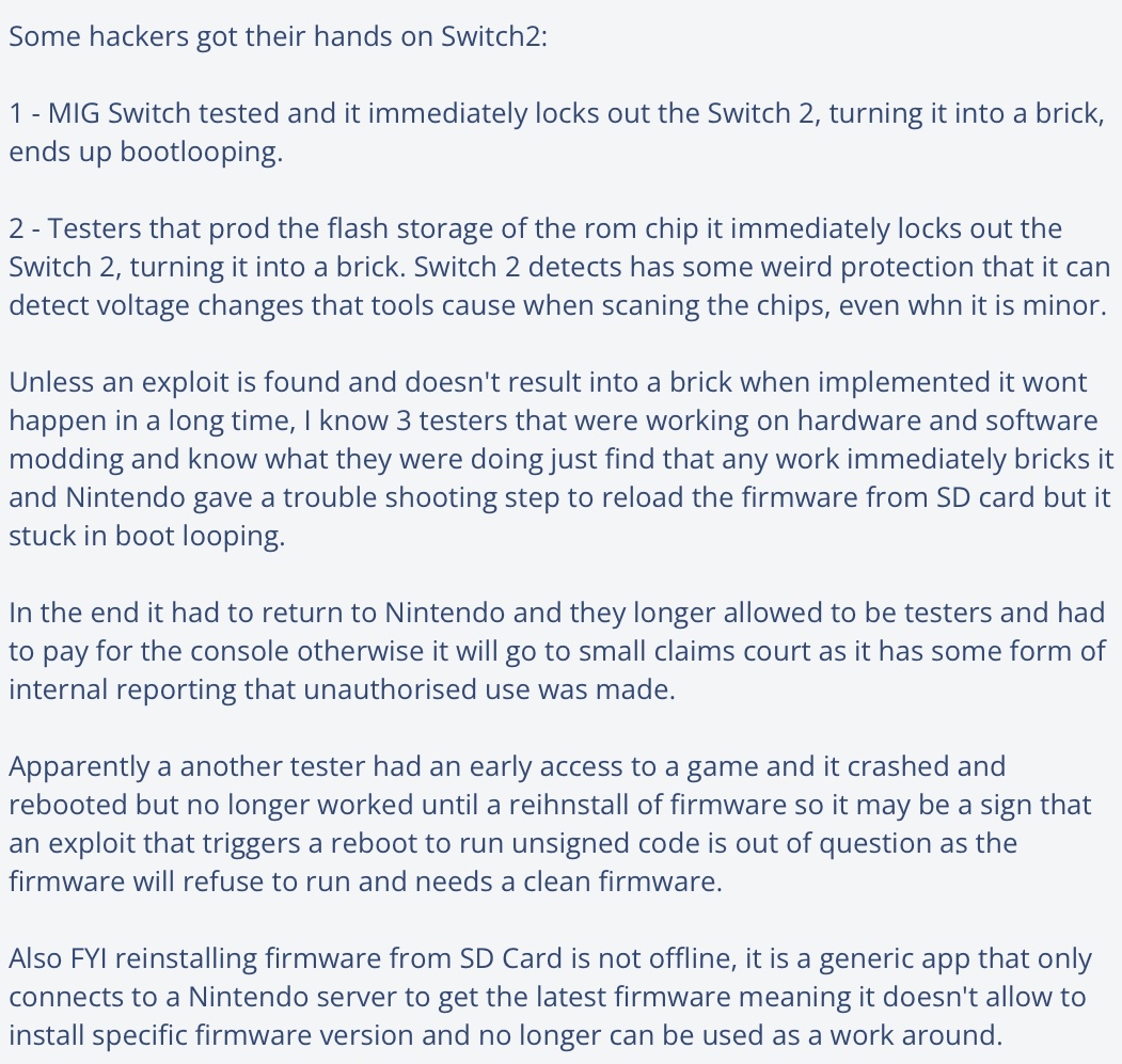 >>2509236 Программный хак есть, его просто берегут для того, чтобы опубликовать после окончания производства Switch 1, оставив побольше консолей уязвимыми к нему, т.к. это именно программный хак, модчипом сейчас и потом будет взламывается любая: >There's another one more interesting but it will have to wait a bit :)