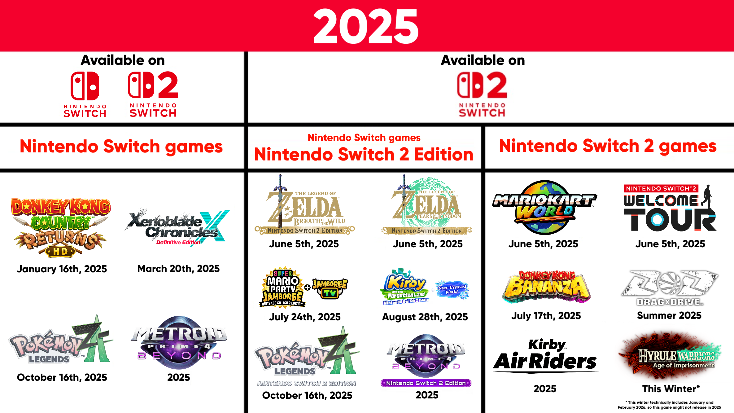 RAIDOU Remastered: The Mystery of the Soulless Army - 19th June 2025 Tamagotchi Plaza - 27th June 2025 Donkey Kong Bananza - 17th July 2025 Shadow Labyrinth - 18th July 2025 No Sleep For Kaname Date - From AI: THE SOMNIUM FILES - 25th July 2025 Story of Seasons: Grand Bazaar - 27th August 2025 Wild Hearts S - 25th July 2025 Drag x Drive - Summer 2025 Tony Hawk's Pro Skater 3+4 - 11th July 2025 Daemon x Machina Titanic Scion - 5th September 2025 Hyrule Warriors: Age of Imprisonment - Winter 2025 Witchbrook - Winter 2025 MARVEL Cosmic Invasion - Winter 2025 Professor Layton and the New World of Steam - 2025 Kirby Air Riders - 2025 Reanimal - 2025 Elden Ring Tarnished Edition - 2025 Star Wars Outlaws - 2025 Borderlands 4 - 2025 Starseeker Astroneer Expeditions - 2026 The Duskbloods - 2026 EASports FC - TBC Madden NFL - TBC WWE2K - TBC NBA2K - TBC Human Fall Flat 2 - TBC Enter the Gungeon 2 - TBC Final Fantasy VII Remake Intergrade - TBC