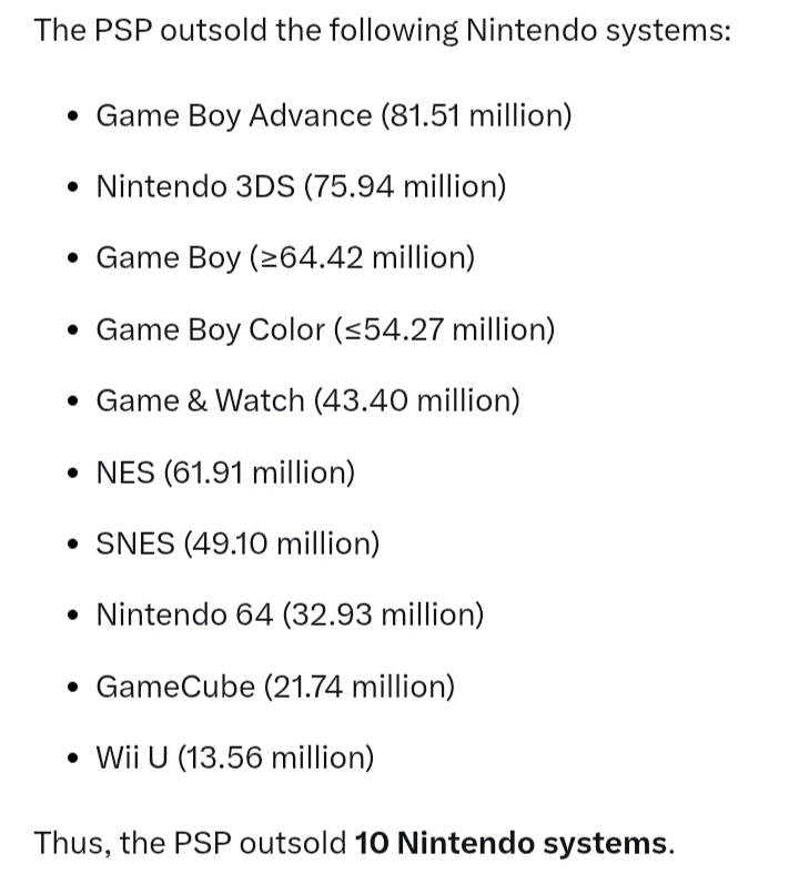 Псп проебала свое поколение. Не смогла в преемственность. А давайте с ней боевую картинку сделаем и будем игнорировать все, просто разведя срач как считать гейм бои, заодно сравним продажи с стационарами из ранних 80ых. Не Сониманевры, твердо и четко.