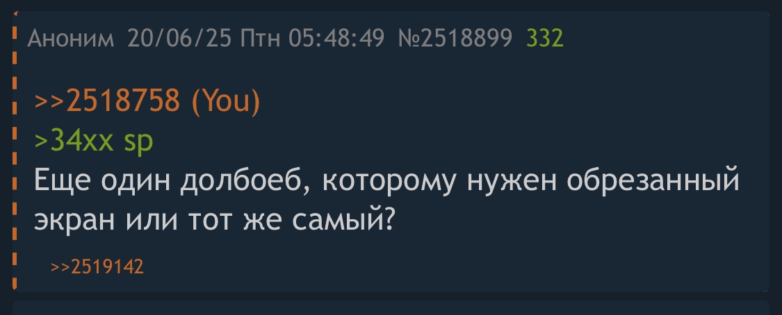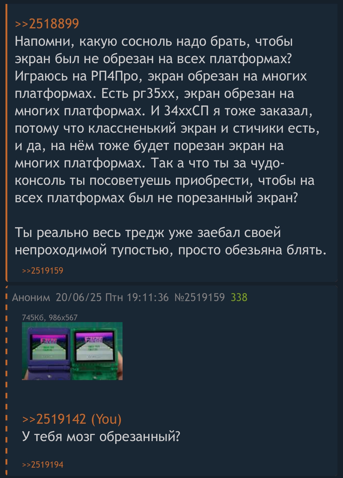 >>2517164 Тут не важно чей вопрос и кому. Если в 2025 на вопрос ретроид/свич отвечают псп, то отвечающий - клинический дебил. Это не мое оценочное суждение, это медицинский факт.