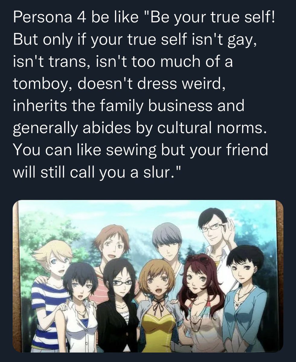 Я никогда не сидел в персон-тредах и вообще не обсуждал персону ни на дваче, ни в интернете/ДТФ каком-нибудь, кроме друзей. Сейчас вот решил зайти, потому что была нужда обсудить СМТ 4, и стало горько и неприятно от вида по крайней мере ру-комньюнити. Жалкое качество постинга про кал, говно, отчим, иди нахуй, инцел, и т.д. Потом посмотрел блогеров по Атлусу - неприятные люди ноулайферы вступающие в стадию оскуфления. Стало горько и страшно, почему так? Я всегда в своем личном мире воспринимал Персону как эстетичную красивую игру для мягких людей, а не рандомобыдла. И сам я в нее играл не будучи скуфом, в тройку я поиграл в школе, пятерка и ее роялы выходили когда я был зеленой студентотой. Можно сказать что П5 стала настолько популярной, что игроки исчисляются миллионами и конечно осядет и мусорная аудитория, но такого низкого качества нет буквально в миллионых гача-тредах, где я бывал.