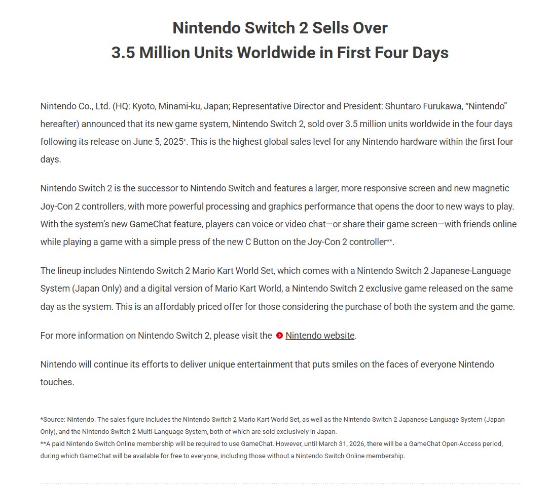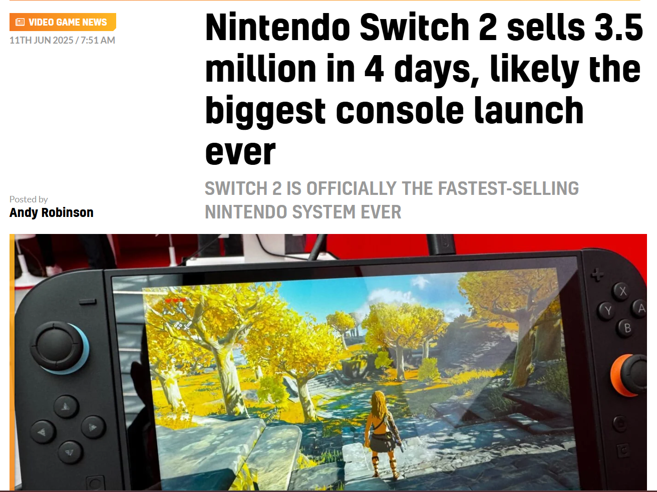 >>2515991 >копиум про то, что PS5 вышла не везде За месяц PS5 вышла на всех рынках. Но разошлась меньшим тиражом, чем Switch 2 за 4 дня. И это при том, что вышла PS5 в рождественский сезон — самое благоприятное время для старта продаж.