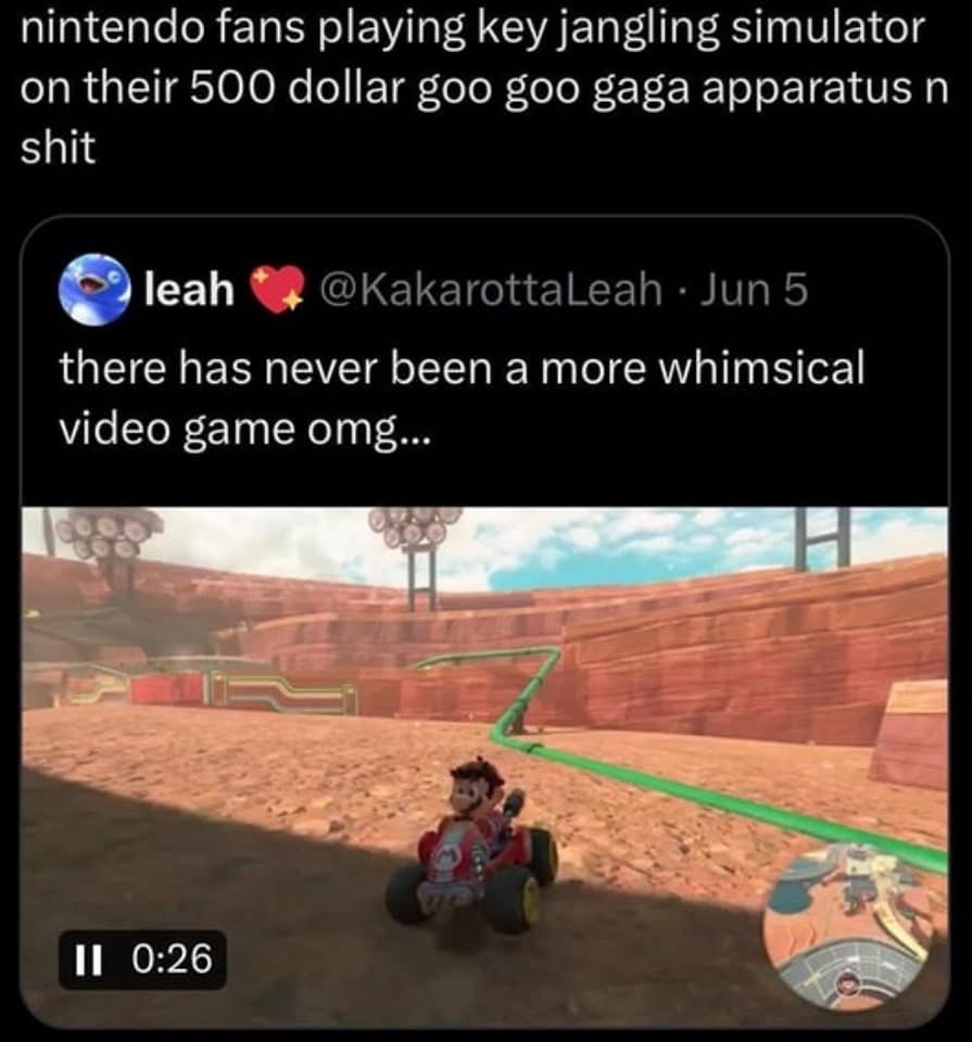 >>2516028 >Мне нравятся игры Нинтендо в опельворлде Очень плохой вкус и тревожный признак аутизма. >ни одного тиктока не сделал Другие зато всласть наделали. >у игрожура/блогера могло быть плохое настроение У всех сразу? И для игры аж от нинтенды? >А своего мнения у тебя нет? Как раз есть, т.к. я терпеть не могу опенворлды, тем более такие аутичные, какие получались у нинтенды и которыми она ранее не занималась. Ботва - самая оверхайпнутая и переоцененная игра со времен своего выхода. Душнейшее калище, клон юби-вышек со скинами из зельды, где некоторые активности заменили на шрайны и убрали маркеры с карты. Просто 10 из 10! >>2516032 Уже кидал список в совсем старых тредах. Идешь на вики или геймфакс, сортируешь игры нинтенды по мета\юзерскору с указанием платформы свитч. Получаешь солидный список говна.