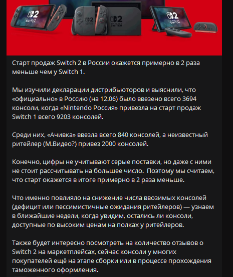 Меня одно радует. Вот у нас конкретно - таких ебанутых крохи, а свитч взлетел из-за взлома и очень агрессивного пиара свича и ботвы на релизе через протыков(когда Сыендук прыгал с парашютом со свичем и т.п.), когда каждый зумерок ХОТЕЛ ПОЩУПАТЬ))) Потом пошел сарафан, затем взлом. Что свитч2 без взлома? Непонятная говнина, на которой можно поиграть в два сомнительных экза и киберпук с лагами и багами как в 2020.