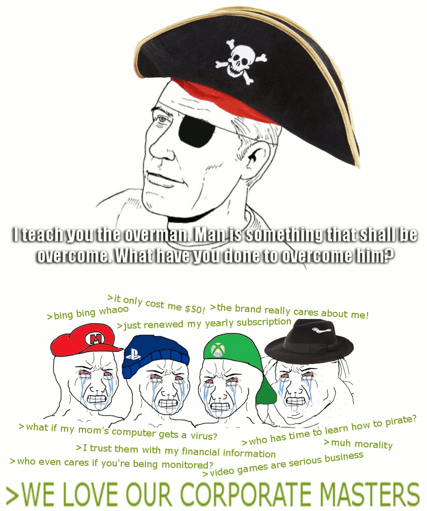 >>2516068 Приложил так приложил, конечно! Кул стори, ну окей. Вот в мире все работает так: ты заносишь денежку, значит тебе нравится и ты хочешь видеть еще, и разработчики тебе наваливают еще. И вот Нинтендо "доит своих фанатов" по фулл прайсу, зато выпустила недавно Марио и Луиджи, хотя это серия была довольно отсосной в плане продаж. Или например сделала ремейк Марио РПГ, который всрался лишь полтора землекопам, но она сделала. Ей платят за то что она делала - и она делает. И ты даешь ей деньги - она делает что ты ожидаешь. Что тем временем делает Сони и Майкрософт? Как дела у иксбокса с хейло? Мало было фанатов? Мало было денег, видимо было мало. Ну или у Сони ничего нету из франшиз кроме Зе ласт оф АСС и хорайзана? А как же анчартед, резистенс и.т.д? Они же хорошо продавались и у них до сих пор есть куча фанатов. Вообще, если смотреть на разработчиков и их лекции, то они очень сильно "сожалеют" о том, что прибили к геймерам жажду скидок и смотрят на Нинтендо, которое не прогнулась и все так же нормально зарабатывает с игр денег. С позиции многих разработчиков и больших студиях, её стратегия - правильная. Думой.