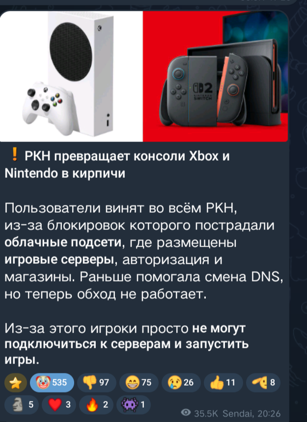 >>2572688 Я тот анон, что написал этот пост. Что ж, теперь официально РКН душит сервера майков, из-за чего мой ебучий Дом ру запрещает войти в аккаунт на консоли, чтобы поиграть по геймпассу. >пора запасаться играми на внешних ЖД Я предупреждал. Если у вас пока есть возможность это сделать - делайте, не тяните