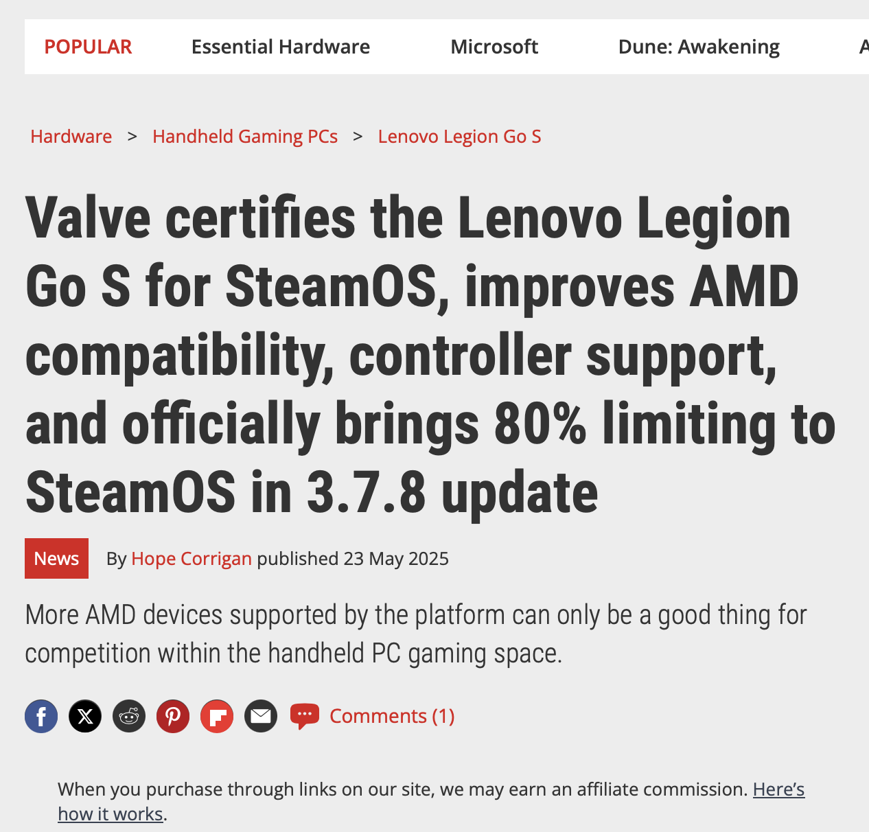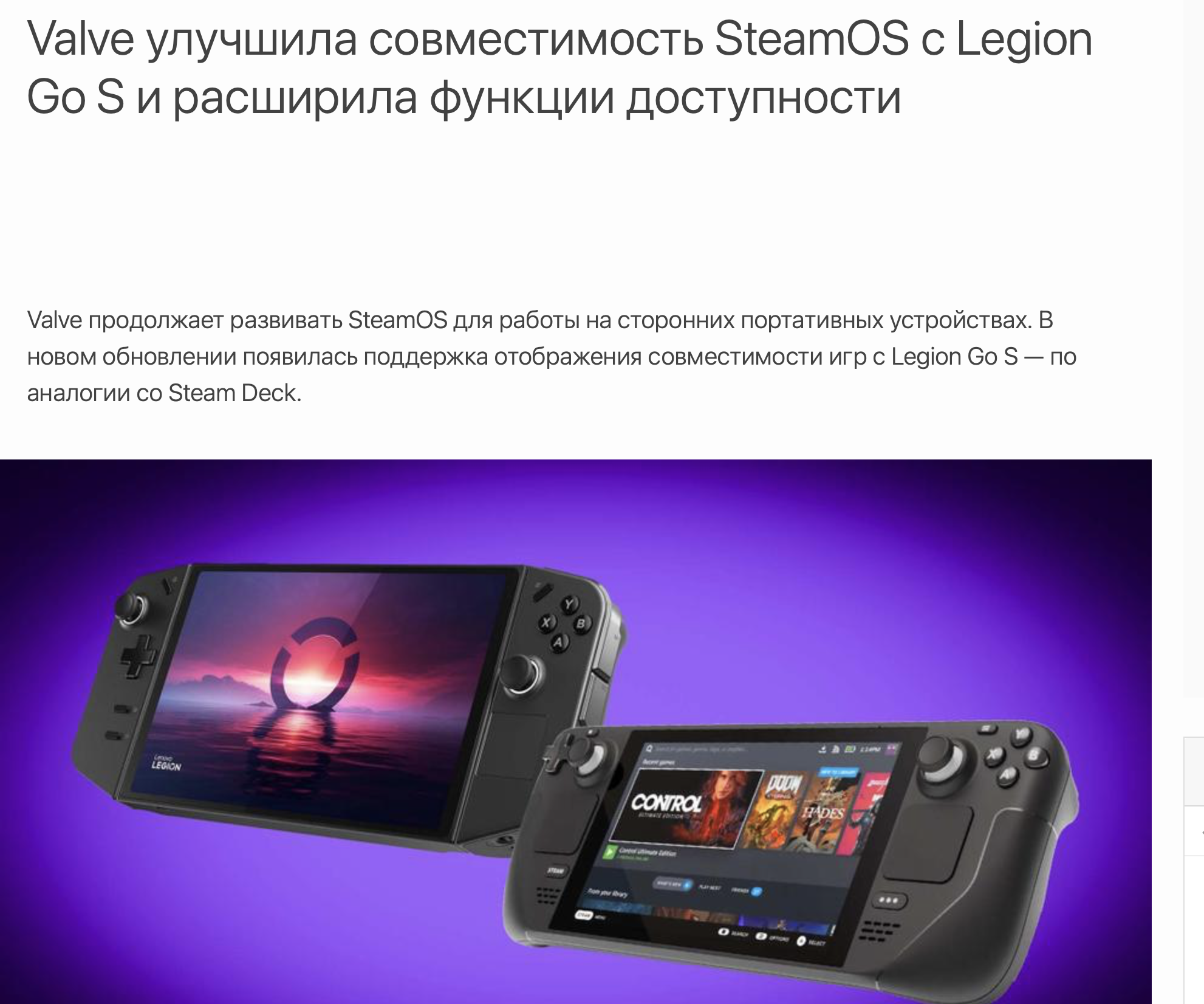 > 30 июня Valve выпустила обновление SteamOS, направленное на расширение поддержки сторонних портативных устройств, включая Lenovo Legion Go S. В библиотеке Steam появилась новая вкладка, отображающая список игр с подтверждённой совместимостью.