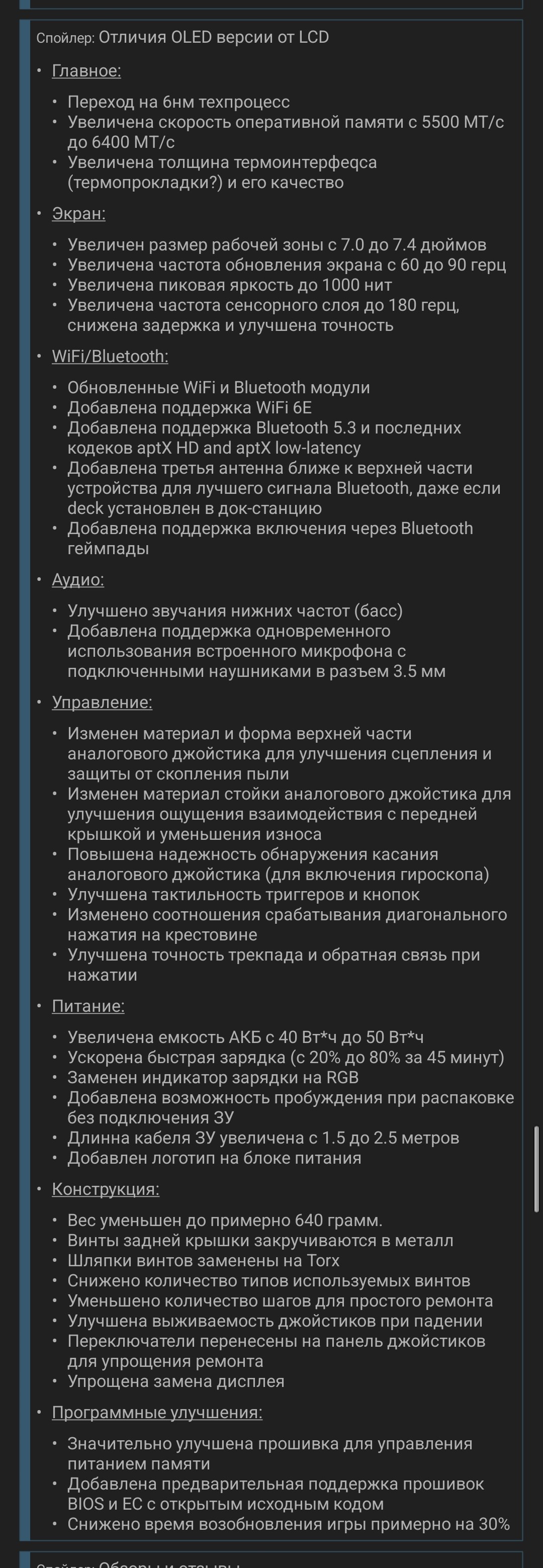 Q: Где и как купить этот ваш этот стимдек? A: Ozon, WB, DNS, Авито или любой другой магазин или продавец с отзывами. Будь внимателен и не торопись, цена на одну и ту же версию в разных местах может отличаться чуть ли не в три раза. Q: Какой объём брать? A: 256Гб хватит если играть по две-три игры за раз, ещё для индюшатины место останется. Берёшь 64Гб — сразу бери SSD на замену (её сделать довольно просто), WD-SN740 или Samsung pm991 к примеру. Либо докупай качественную SD-карточку, например SanDisk Extreme Pro либо Samsung Pro Plus. Q: В ААА не поиграть? A: Поиграть. Относительно свежие ААА дают 30 кадров и более в средне-низких, есть всякие фпс-локи и прочие настройки для совсем тяжёлых. Q: Сколько держит батарея? A: Зависит от выставленных настроек, яркости и самой игры. От 1.5ч в традиционно неоптимизированном кАААле до 6ч и более в безграфонном инди. OLED-версия живёт от батареи на 10-20% дольше. Q: Как устанавливать пиратские игры? A: Перенести установленную (или портабл) папку с игрой с компутера на дек и "добавить" её EXE-файл в Steam. Способов переноса несколько, гугл в помощь. Либо поставить на дек торрент-клиент и скачать игорь сразу туда. Q: Закатил в дек пиратку, а она лежит в библиотеке серым кирпичом, хочу обложечку! A: Ставишь decky — сборник плагинов. В нём SteamGridDB — плагин для удобного навешивания артов и обложек. И ещё много всякого. Q: Эмуляцию завезли? A: Естественно. Есть отдельные эмуляторы во встроенном магазине приложений (где всё бесплатно), есть Emudeck. Все основные эмуляторы в нём уже есть. PS3 эмулируется так себе, от игры к игре, Switch эмулируется неплохо, 40 кадров наберётся. Q: Хочу установить Шиндошс / переустановить SteamOS! A: Дек прекрасно загружается с флэшки, шаманишь Rufus'ом, втыкаешь в консоль через OTG-адаптер и вперёд. Можно сделать дуалбут, но придётся делить SSD на две части. Q: Он тяжёлый? A: Тяжелее большинства портативок, но отличная эргономика и продуманный дизайн делают своё дело, дискомфорта при долгой игре нет. Q: Заведётся ли игра_нэйм на деке и будет ли нормально работать? A: https://www.protondb.com/explore, но с вероятностью 99.9% всё заведётся и работать будет. Q: А вот посмотрите [очередной_стопицотый_"УБИЙЦАстимдека"], он жи лутьши))) А: Отлично, мы за тебя рады, пройди в тред по нему, а если нет - создай. Q: Что насчёт Стимдек-2? Когда будет? Что внутри? Может, подождать его? А: На данный момент кроме слухов ничего нет. По словам вальвы новый дек выйдет только когда будет прорыв в технологиях. Ждать смысла нет, текущий стимдек отлично держится и будет держаться ещё долго - играет эмуляторы b старьё, а немалая часть свежайших релизов специально под него оптимизируется. Q: Ваша шапка гавно, у меня ещё куча вопросов! A: Как ни странно, гугл. Одно из преимуществ дека — огромное и активное коммьюнити в стиме, реддите и куче других сайтов, а ещё триллиард видев на slowтюбе. С вероятностью 101% твою проблему уже обсосали и решили.