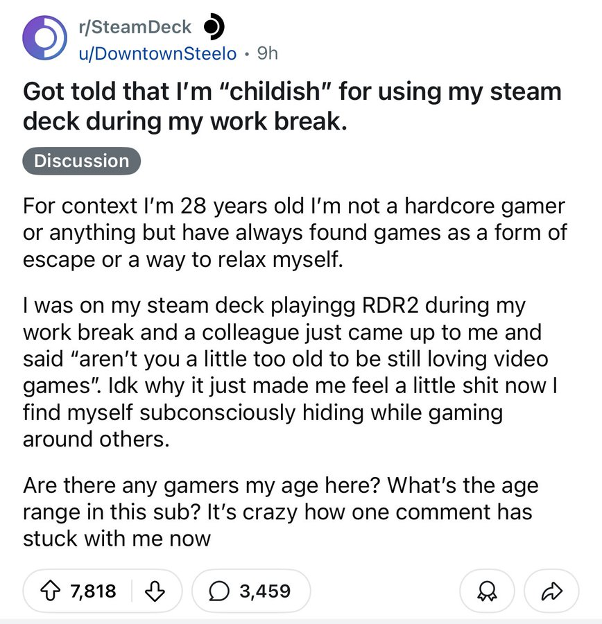 >>2530647 мне 30 лет и я на работе только и играю в стим дек, я его специально купил, чтобы показывать его и все видели, что я играю в пиксельные инди игры из стима, о которых никто не знает