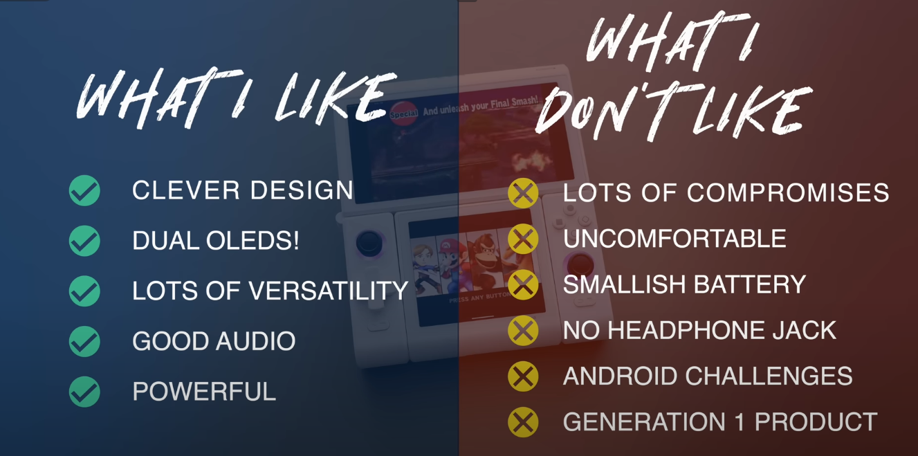 >>2536047 Я хотел Флип 2, но минусы перевесили: 1. Без сенсорного экрана андроидом пользоваться невозможно. Чтобы банально яркость настроить нужно перехватить консоль, придержать рукой сзади экран, чтобы он не разложился на 180, потыкать пальцем, вернуться к игре. А тыкать пальцем придётся часто, хоткеев, которые работали бы во всех приложениях не завезли, да и часто интерфейс просто не расчитан под кнопки. 2. Шарнир у Флип2 тоже оказался уёбищным и весь реддит завален фотками трещин. Удивительно, но кажется только Анберники смогли в нормальный шарнир (Скопипиздив его у ГБА СП)