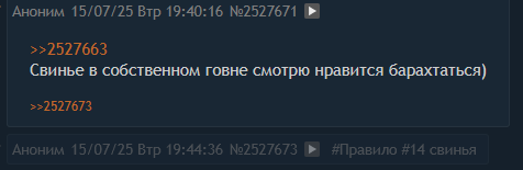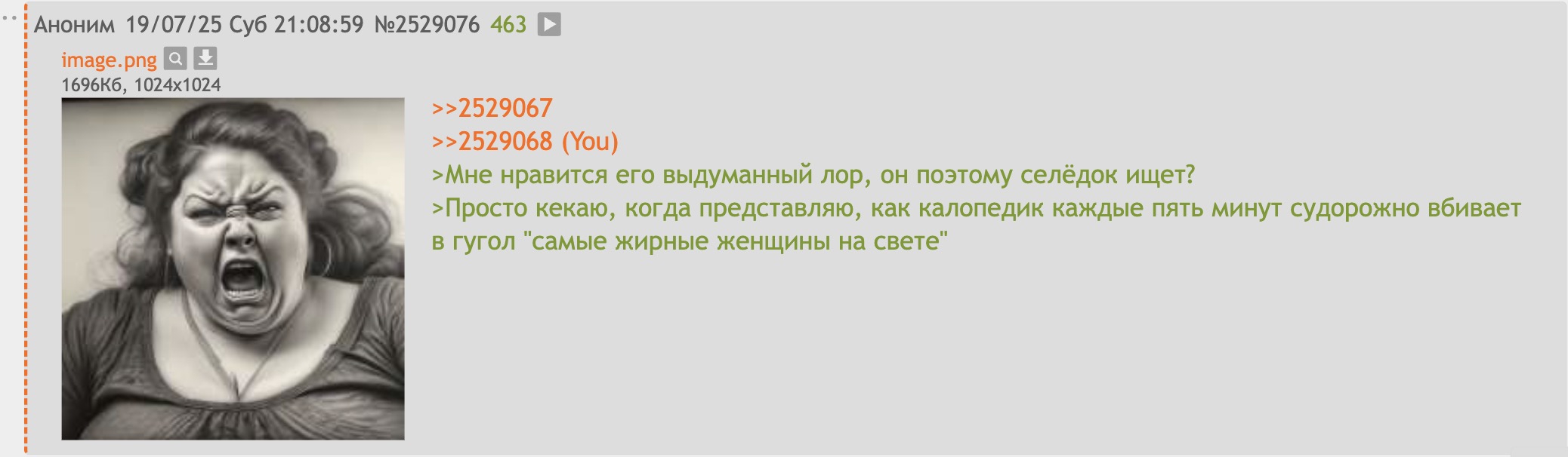 для анонов кого это заебало, понять вас могу, про историю с детектом жирухи я писал в прошлом треде вроде бы. Это его защитная реакция на мою фразу про то что девушки на улице когда смеются, это они смеются не над ним. Чтоб не переживал. Видимо задело за живое, раз этот шиз теперь тупо во всех детектит сельдь свою, а меня тут вчера вообще не было. Особенно смешно что он делает это с таким пафосом, а на деле выглядит ещё более ущербно, это получается его жируха попускает. Но у него видимо в голове он победитель, хуй знает. Анон котороый участвует за каждую сторону и подначивает потому что это "Amuse me" Тебя видно, но я надеялся что ты перестанешь этим заниматься. Увы. А вообще вы сами продолжаете ему отвечать, от этого тред и не юзабельный. Выходных вам, аноны, хороших, а шизу поскорее врачей и девушку, ибо такой пункт на сельди говорит о пиздец каких комплексах. Ты либо найди себе жируню, либо прими себя как ТНН.