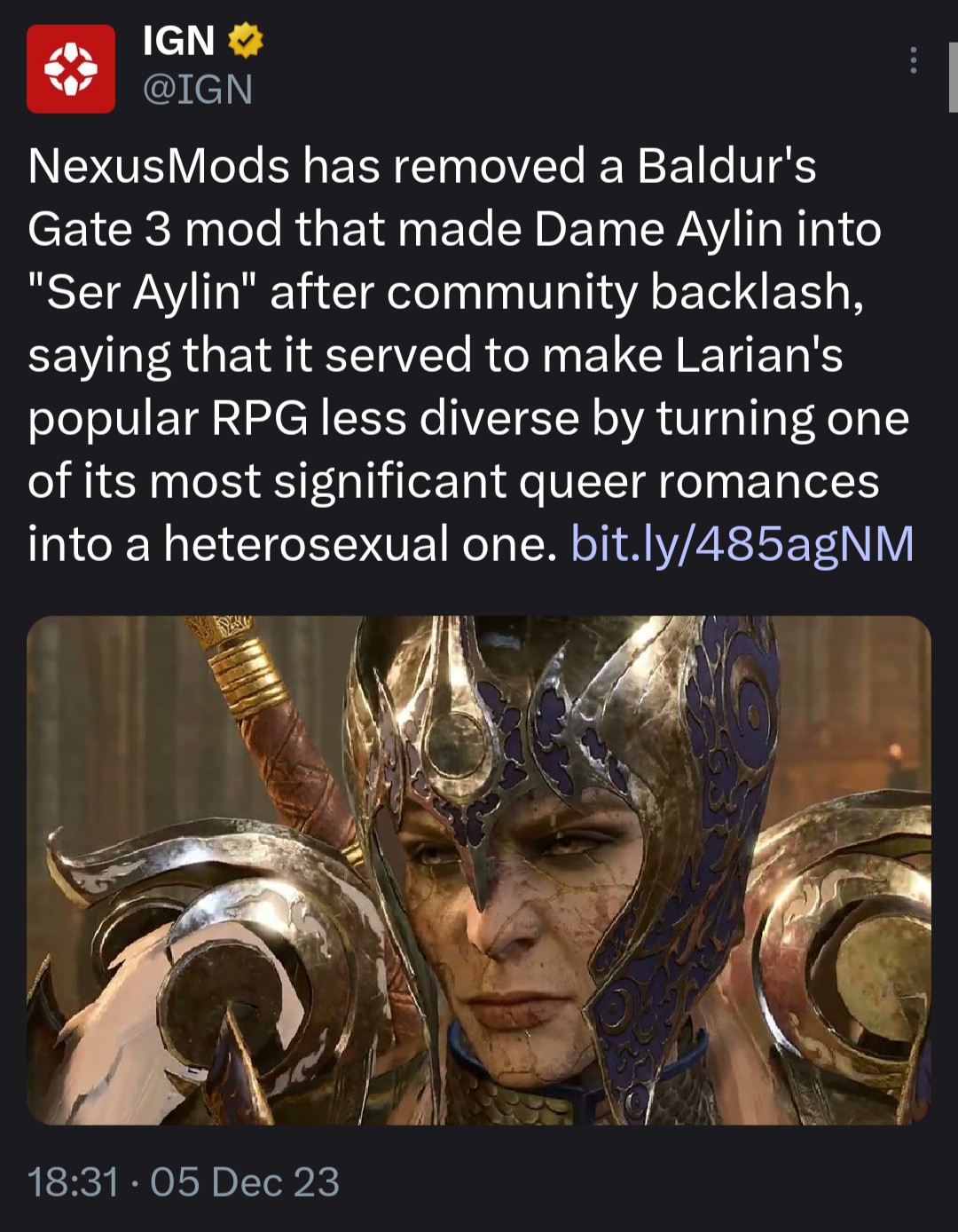 >>2534921 Так может им похуй на повесточку, потому и не упоминают? Мне личной похуй, в БГ3 отыграл с удовольствием, планирую второй раз тоже отыграть. Да, лесбухи, да, пидорасы, но мне лично абсолютно это фиолетово - что есть, что нет. А вот рычащие слюнявые зомби, прыгающие в камеру, че-то не вставляют совершенно, поэтому в деревню играть не планирую. Как-то так.