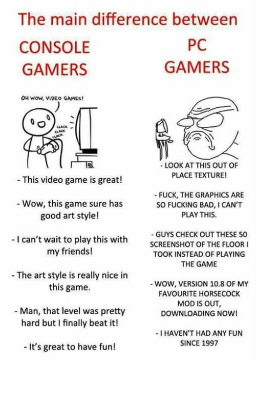 И я понимаю консольщиков, консоли для казуалов которым достаточно купить мыльницу и играть ни о чем не думая. Это можно понять, не разбираешься, просто купил и играешь, окей, твой выбор, но зачем тогда кукарекать о железе в котором не разбираешься? Вот где ебанутая странность. Кто разбирается в ПК железе, это явно не консольщик. Зачем тогда эти ебланы кукарекают как эксперты по ПК, мол "мыльница будет как топовое ПК-железо", будто сами пекари? Совсем долбанутые, лишь бессмысленно и бездумно перепукивают что им сренькнули в рот рекламой.