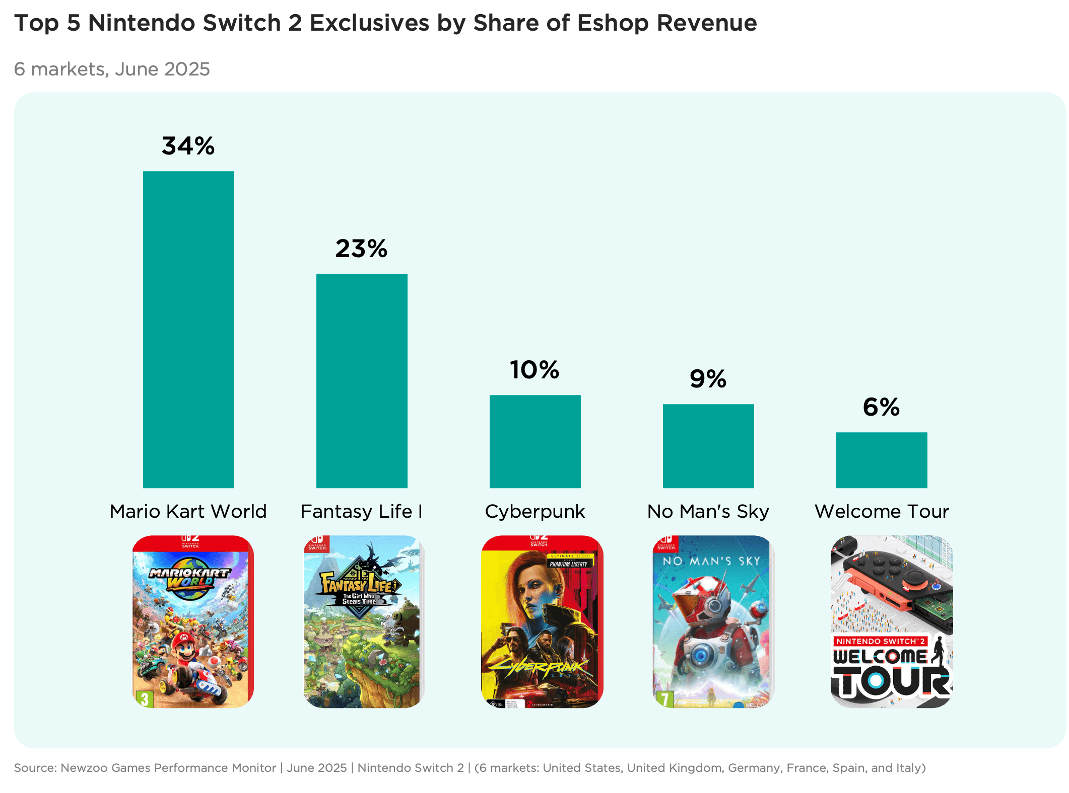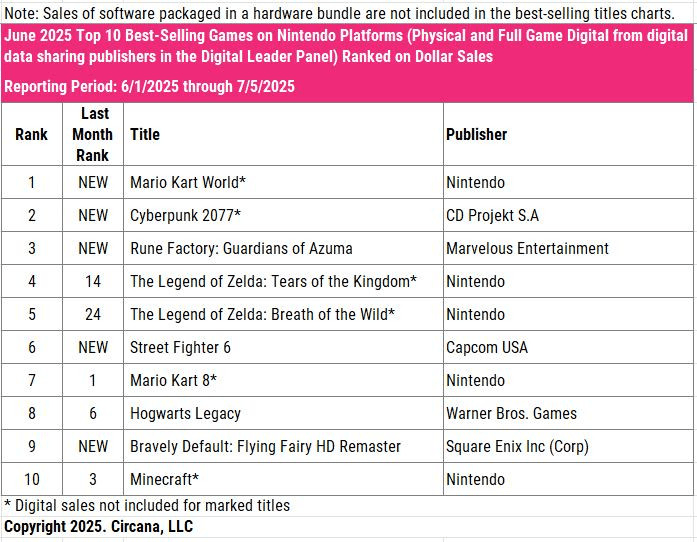 Mario Kart World захватила лидерство по доле цифровой выручки в eShop с результатом в 34%. В тройку также вошли Fantasy Life I (23%) и Cyberpunk 2077 (10%).