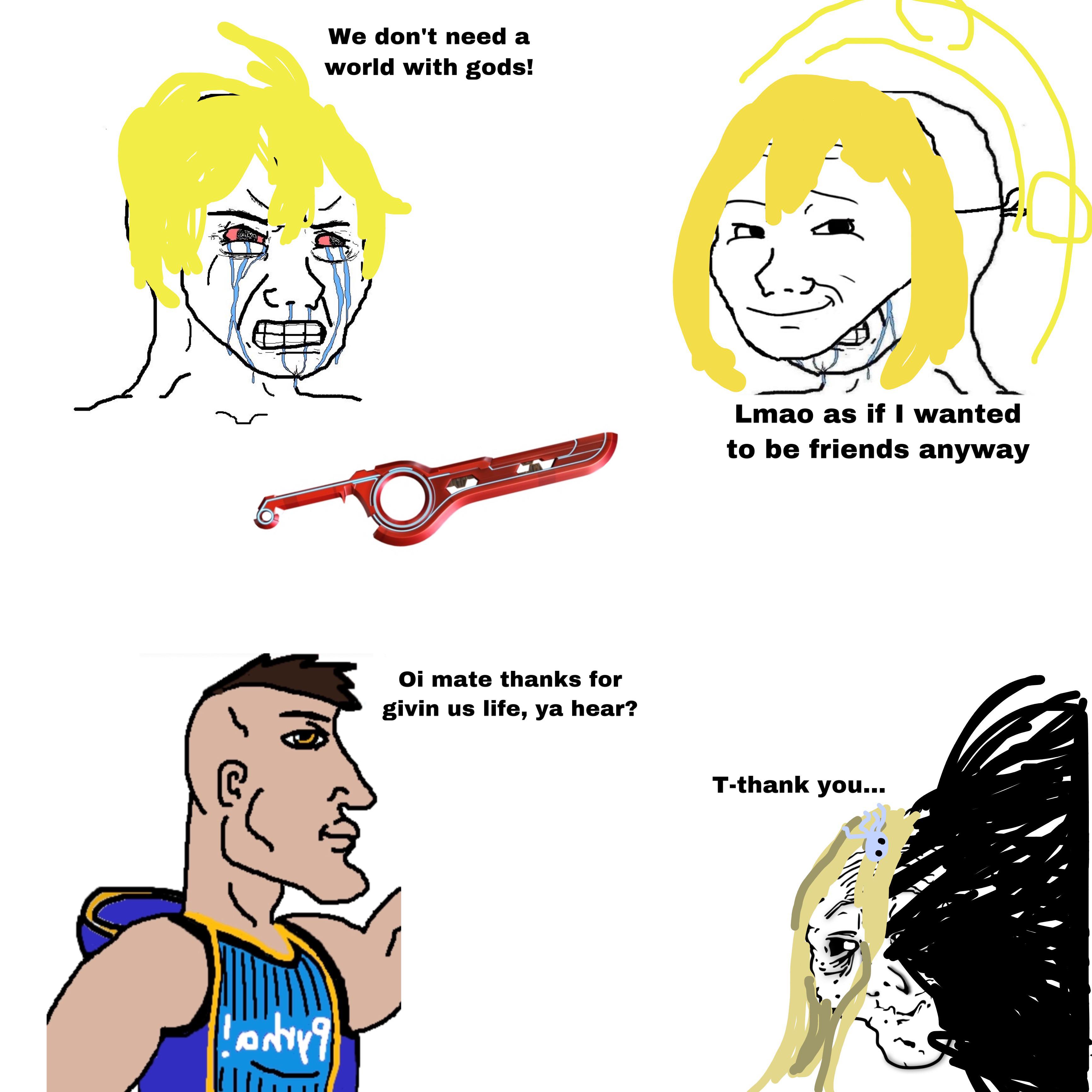 >>2530719 >Постиг суть своего мира и выбрал быть обсолютом в нем. Ты вообще в игру-то хоть играл, лол? В конце когда Алвис спросил Шулка: "Бро, богом будешь?", Шулк ответил: "Уф, пук, я не знаю. П-пусть будет мир без б-богов, н-наверное, пук". Отрастил патлы, потому что не умеет стричься. Один сын эмодаун, ставший мёбиусом, второй — зашуганный заморыш. Тем временем Рекс это буквально воплощение гигачеда. Вывел создателя мира из тысячелетней депры, ебашит клейморами с двух рук и абсолютно легально имеет фертильный, мать его, гарем. При чём одна из его тяночек литералли королева планеты, а обе дочки стали спасительницами мира. Недаром Rex на латыни означает король.