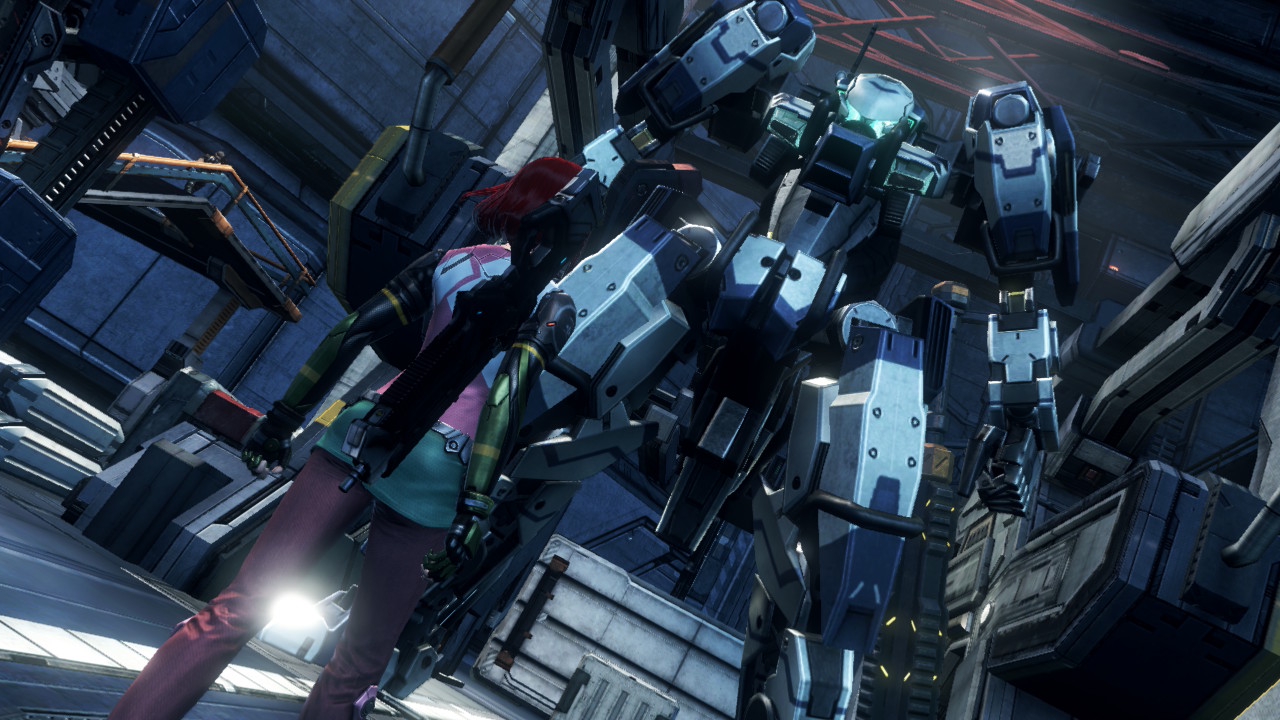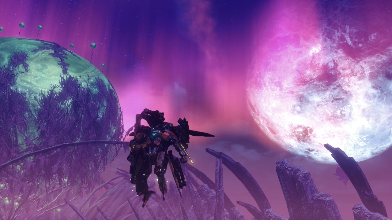 Музыка отличная, я играл в европейскую версию, все песни и темы локаций понравились. Но музыка приводит к еще паре проблем, в игре НЕТ НАСТРОЕК ЗВУКА и постоянное прерывание музыки при перемещении на мехах. Если с первым все просто и терпимо, иногда песни громче чем диалоги, иногда очень заебывают крики команды, иногда эффекты слишком громкие типа овец вначале которые постоянно блеют. То второе просто сумасшедше бесит и портит игру. Примерно на двух третьих сюжета игроку дают полетный модуль, который заменяет прыжок меха навсегда. Это приводит к тому, что каждый раз когда тебе нужно прыгнуть, а это требуется часто из-за инерции и подлета на объектах местности, включается полетный трек с долгим вступлением, трек локации отключается, при приземлении музыка локации начинается заново, при взлете полетная музыка начинается заново. Настолько базовая вещь, которая работает на специальных боевых треках, абсолютно ужасно работает в самом частом сценарии игры. С этим очень сложно мириться.