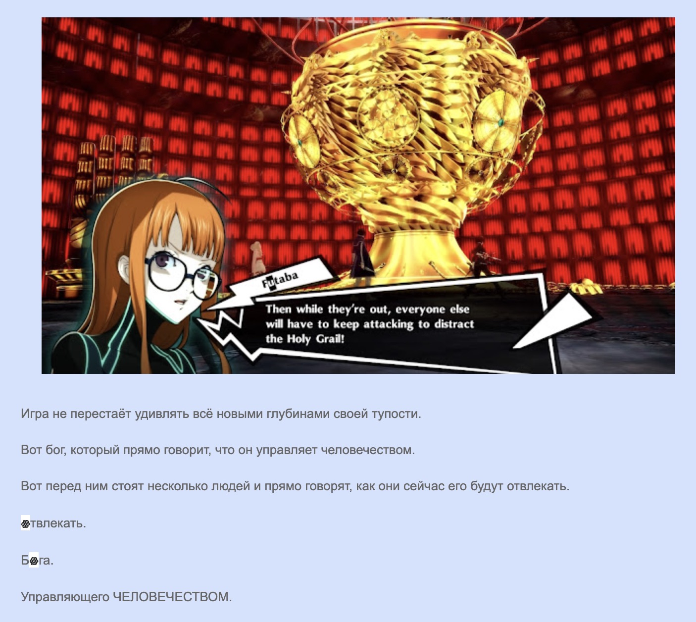 >>2538841 >>2538842 > тупые пердиксы не могут в логику Я понял сюжет. Тупым быть от этого он не перестаёт, как и вся п5. Игра не знает, чем хочет быть. То "ууу сехс с несовершеннолетними плоха!!!", то на тебе училку на поебушки. Это ДРУГОЕ! Несклеенность конфидантов и основного сюжета (болячка всех персон, начиная с 3). Персон получают то от злости, от бунтарства, то от принятия своей Тени, как в 4. У злодеев тут грехи приписаны, но с какого-то хуя и Футабе. А чё про остальных?)) Тупая параша с мотивационной речью и ПРЕВОЗМОГАНИЕМ. "Ууу, 100% поверили в воров!!!!". Пиздец блять. Ебаная графомания, где тебе каждый пересказывает события пятиминутной давности, которые игрок и так видел. Ну а хули, у пердиксов нет концентрации внимания, СДВГ, все дела, чё там ещё себе малолетки любят самодиагностировать. Тупость дебилов, которые орут про то, как будут ебать бога в конце, когда он всему городу мозги промыл, что гг - апасный... Тупость прокурорши, которая забирала про зладея, подставилась, и злодей РЕЗКО переобулся, не додумалась, кто дал ей визитку, и чё творится с ее сестрой. И так можно продолжать до бесконечности.