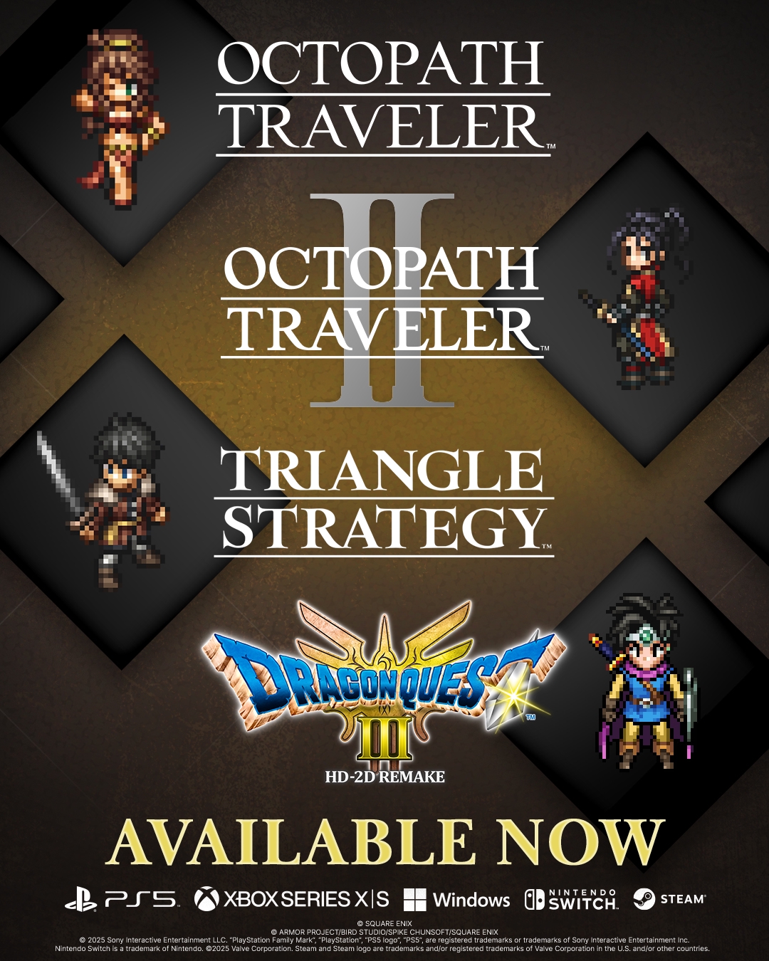 Triangle Strategy, Octopath Traveler, Octopath Traveller II, andDragon Quest III HD-2D Remake are available on PlayStation 5, Xbox Series X|S, Microsoft Store, Nintendo Switch, and Steam.