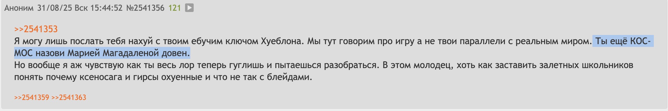 >>2541543 >>2541560 Истеричка, тебя вчера так жёстко ВЫЕБАЛИ, что я на твоём месте вообще побоялся бы в тред в ближайшие лет этак пять. Это был невыносимый позор. А так да, КОС-МОС сосуд для сознания Магдалены/Анимус.
