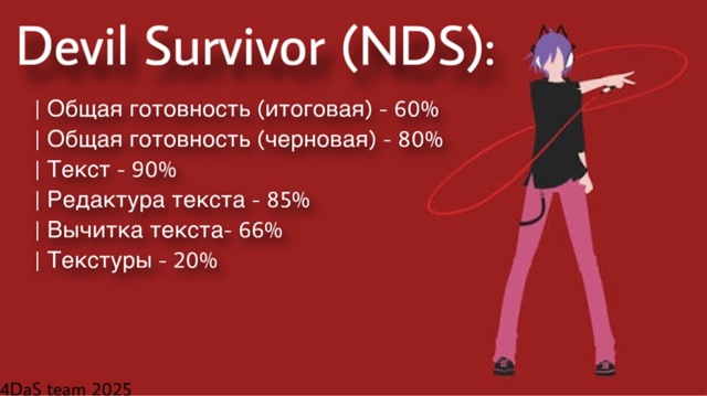 Тем временем хорошие новости об переводе Devil Survivor: Чтобы вы не думали, что мы умерли: Работа над переводом Десу продолжается. Уже проделан огромный объём работы и у нас остались некоторые нерешенные проблемки, но мы продолжаем трудиться! Надеемся успеть выпустить новую сборку этой зимой) Вот текущие проценты готовности перевода. Спасибо, что остаетесь с нами!