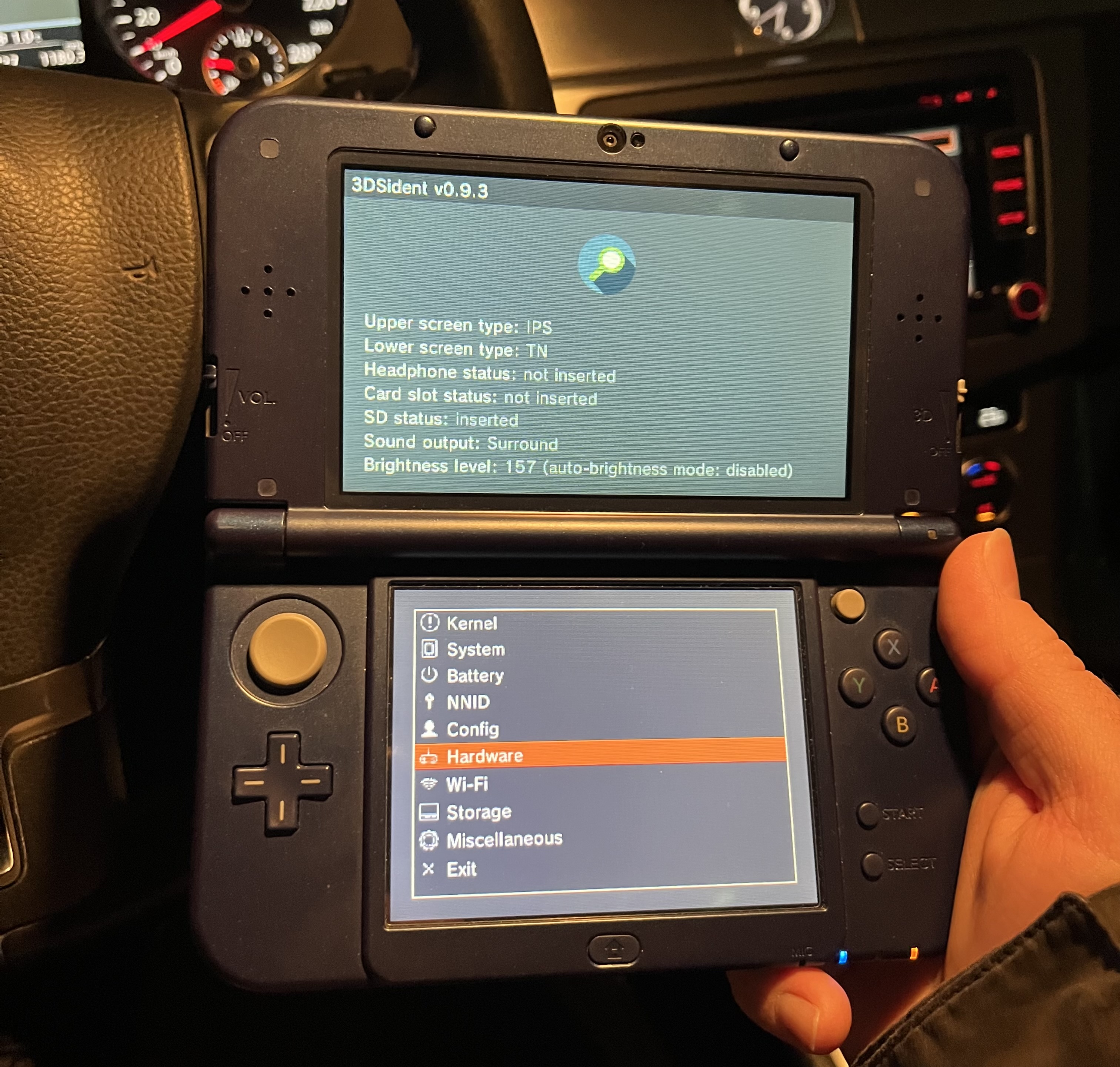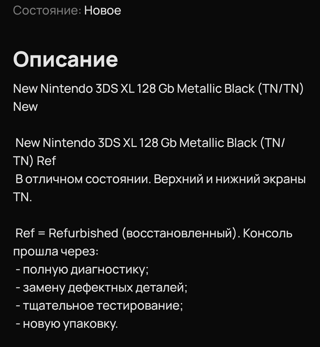Чтож. Одна 3DS - хорошо, две 3DS - лучше! Я решил что останавливаться на достигнутом не хочу. Зато хочу собрать всю коллекцию приставок Nintendo. Что будет не так просто, особенно учитывая цены на все это добро. Но, как сказал уважаемый мной анон выше - «Дорогу осилит идущий». Купил эту newшку за 18т.р. Сам в шоке, учитывая пик и ее состояние в общем (8 из 10 на мой взгляд). Но продавал ее человек который взял ее поиграть ребенк, а тот через неделю ее забросил. Естественно о том какие там стоят экраны он не знал. Но, справедливости ради, я ехал с полной уверенностью в том что это пара TNок. Однако вот так вышло. А помимо этого мне пришлось ехать за ней в Лобню, вдоволь настоявшись в поддсных пробках.