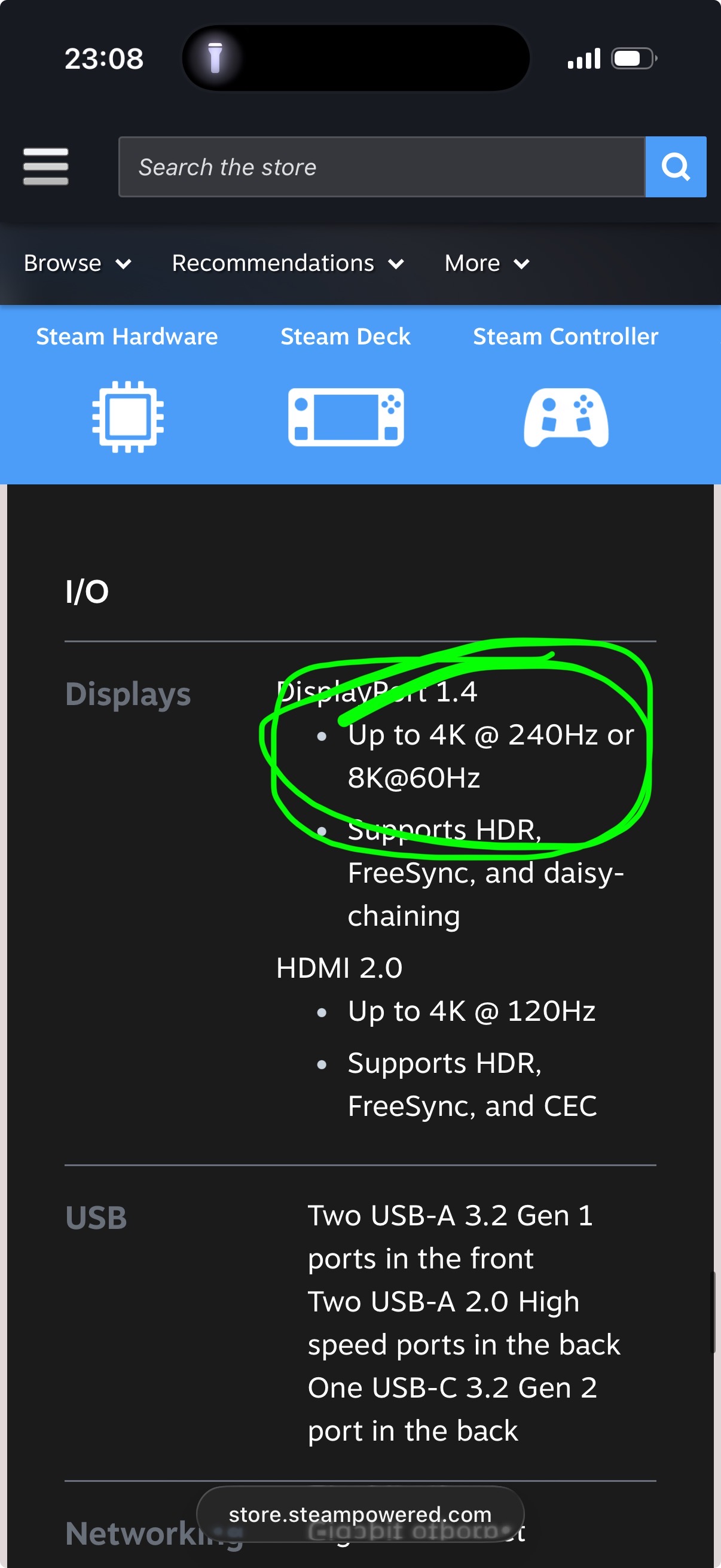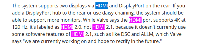 >>2559588 Система поддерживает два дисплея через HDMI и DisplayPort на задней панели. Если вы добавите концентратор DisplayPort сзади или используете последовательное подключение, система сможет поддерживать больше мониторов. Хотя Valve утверждает, что порт HDMI поддерживает 4K на частоте 120 Гц, он обозначен как HDMI 2.0, а не HDMI 2.1, поскольку в настоящее время не использует некоторые программные функции HDMI 2.1, такие как DSC и ALLM, над которыми, по словам Valve, «мы сейчас работаем и надеемся исправить в будущем»