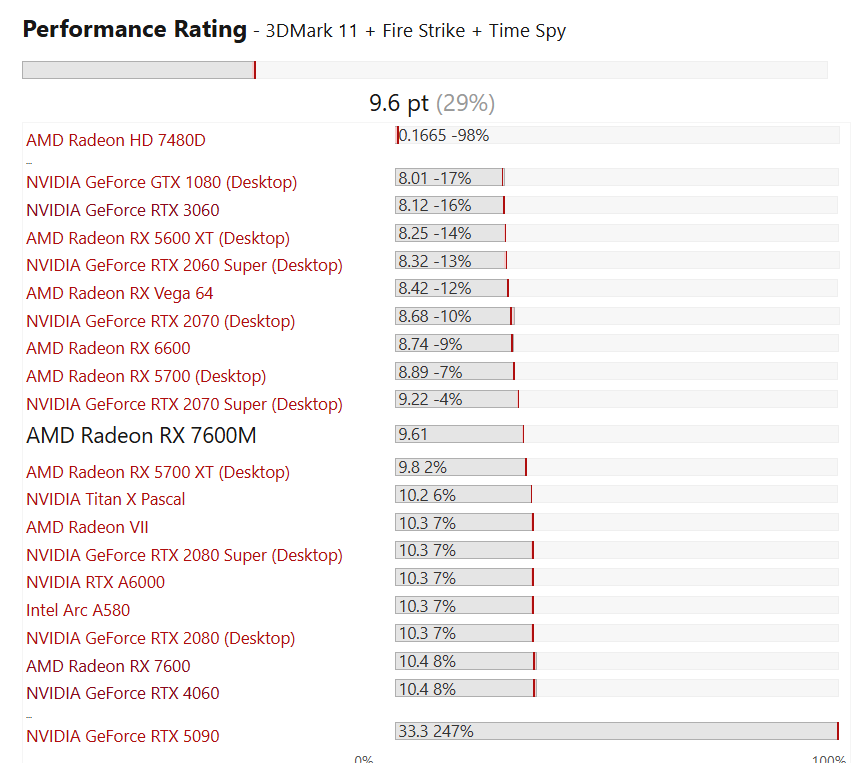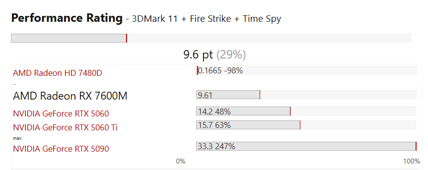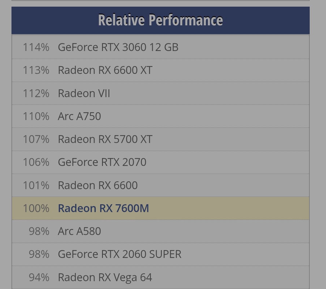 >>2560013 >Да даже если производительность будет на уровне между 7600 и 6600 Как хорошо, что никто не знает что видеокарта в говносборке RX7600M, которая по мощности как GTX 1660.
