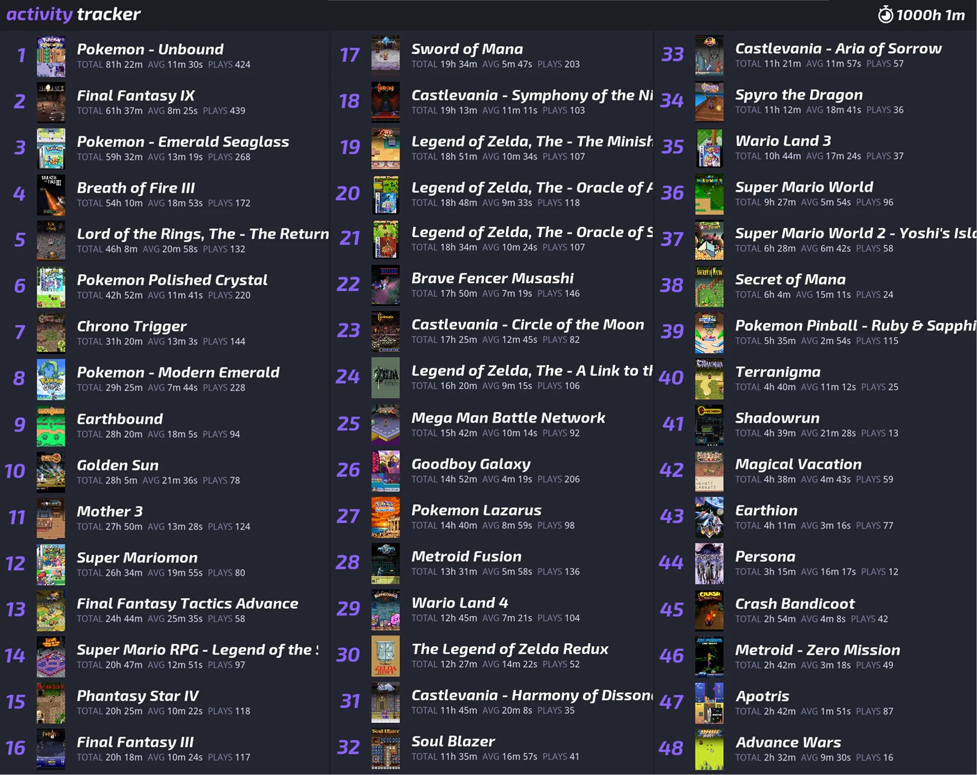 >>2569387 На gba каcтельвании и metroid fusion, покемоны если такое заходит, на snes - chrono trigger, donkey kong, mega man X, The Legend of Zelda: A Link to the Past, super metroid. На PS хз в свое время играл в twisted metal, silent hill, resident evil, финалки.